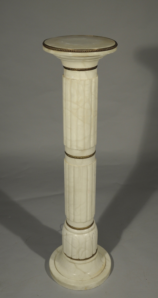 - GAINE LUMINEUSE adoptant la forme d'une colonne cannelée en albâtre baguée de rais de perle en laiton. Base de forme ronde. Haut. 103, Diam. 26 cm.