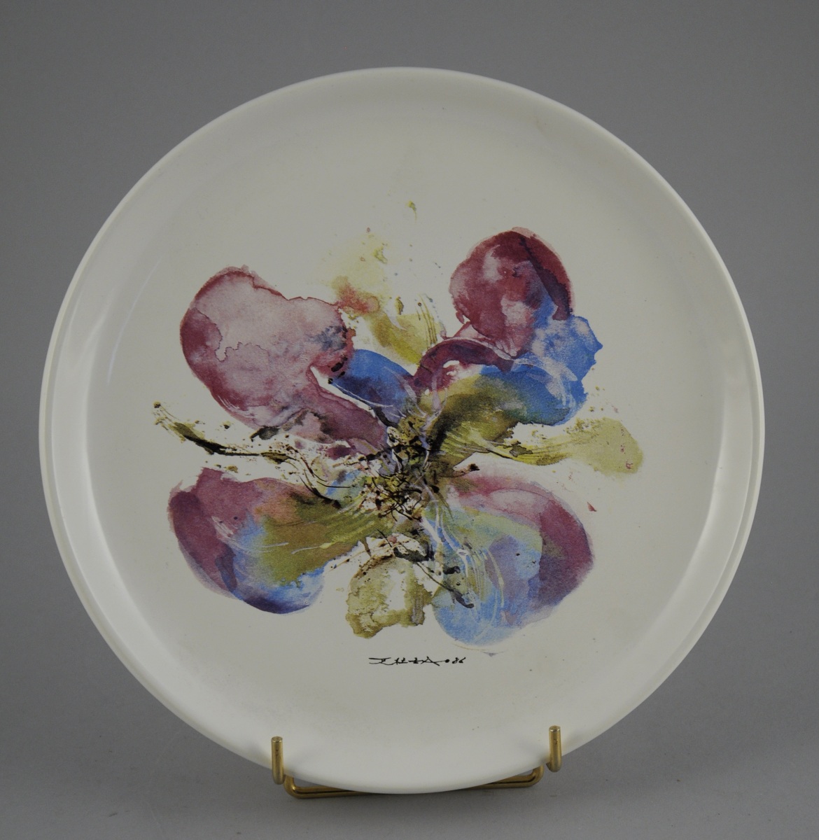 Orchidées. ATELIER de SEGRIÈS. ASSIETTE en faïence, le bassin orné en décalcomanie polychrome d'une oeuvre de Zao Wou-Ki. Le revers marqué "Vingt ans de B.S.N. / 1966 - 1986 / BSN existe, BSN se développera grâce à l'instinct, l'imagination et le courage de tous / juin 86".
