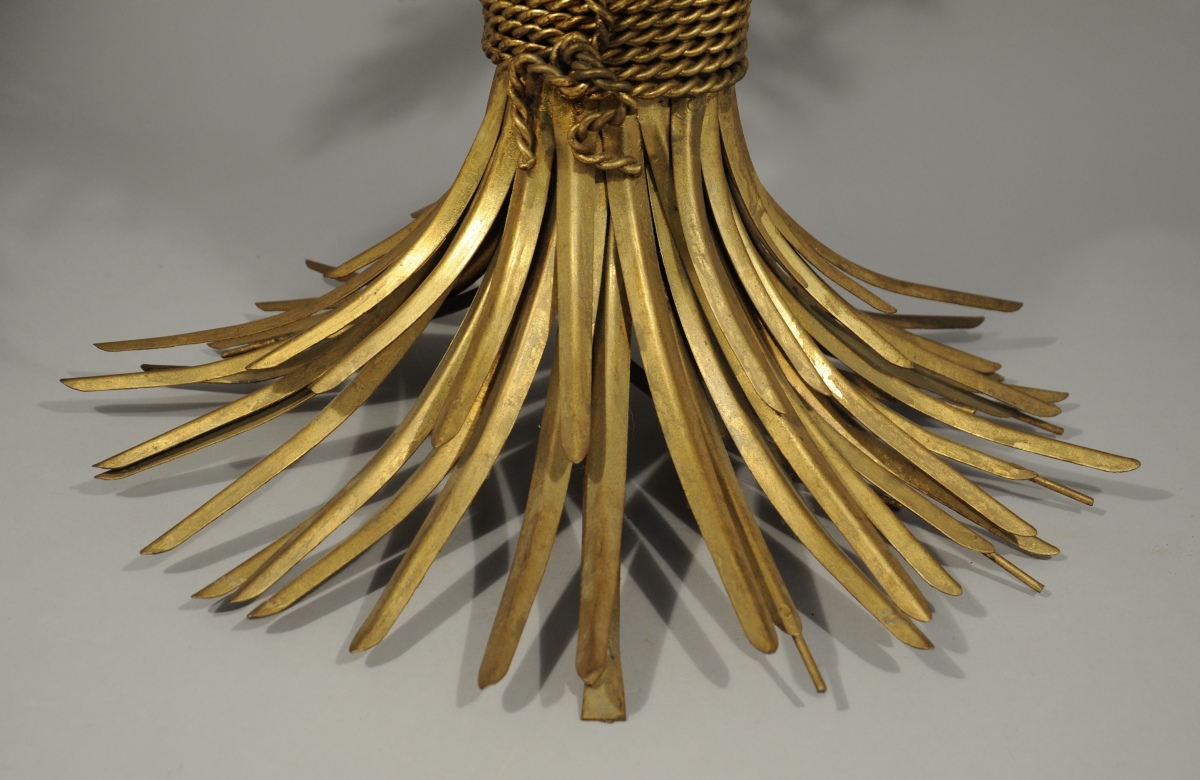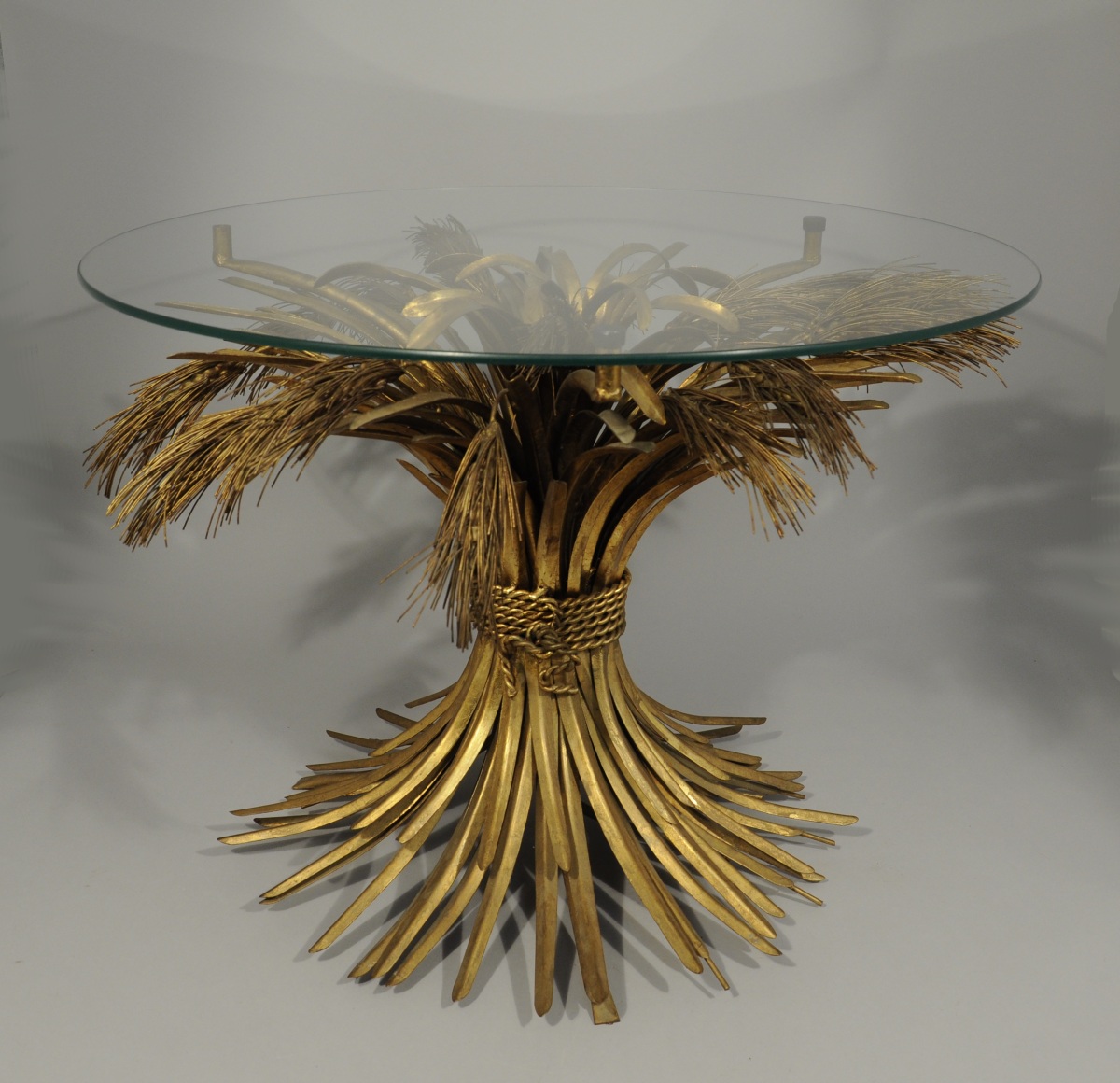 TABLE BASSE dite "GERBE DE BLÉ". Le plateau circulaire en verre repose sur un piétement central en métal doré à l'imitation d'une gerbe de blé.