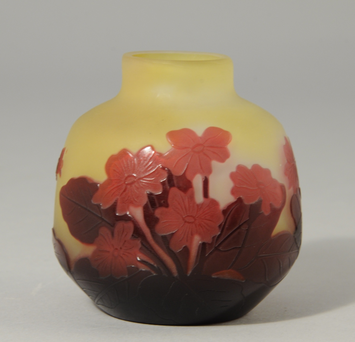 Émile GALLÉ (1846 -1904). VASE boulle à léger col en pâte de verre à décor de feuillages et de fleurs de couleur prune dégagés à l'acide sur fond jaune. Signé.