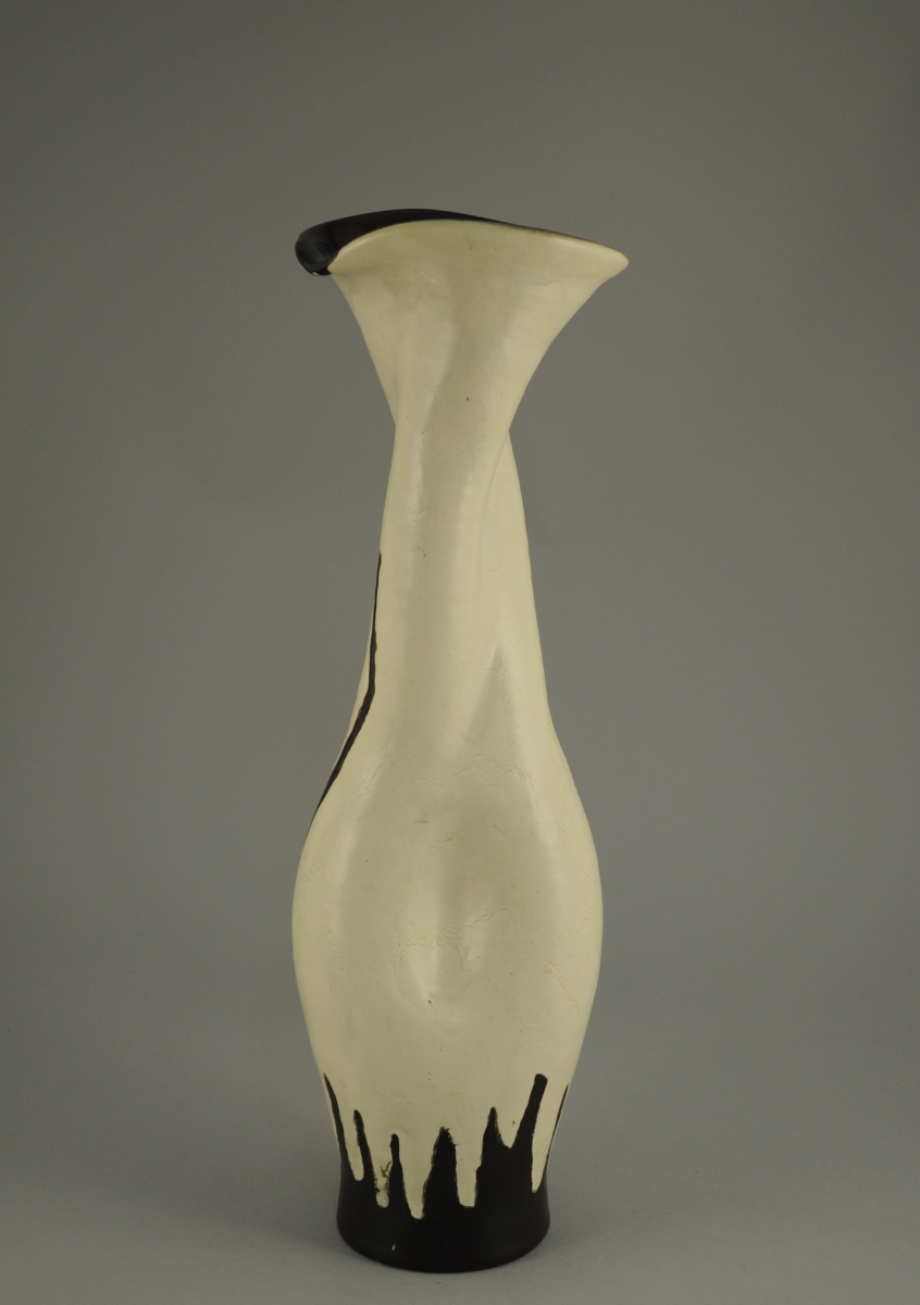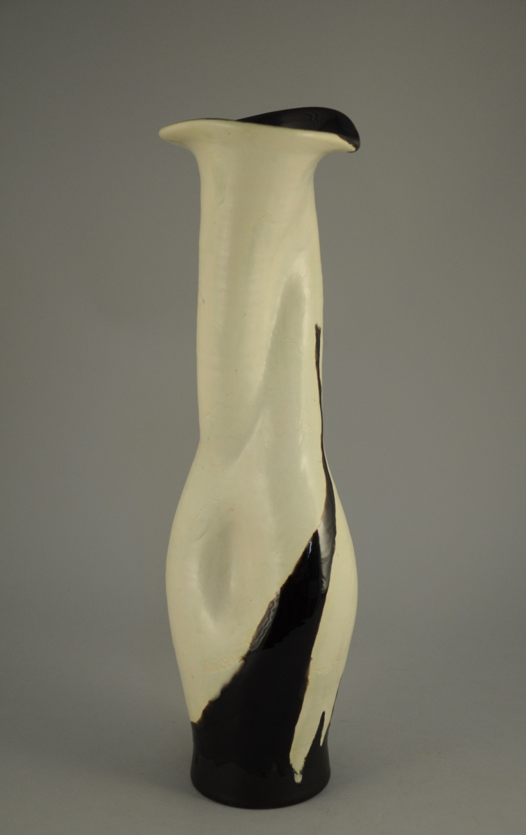 LUDE. VASE balustre à col évasé et panse applatie en céramique émaillée crème et glaçures chocolat mates et brillantes.