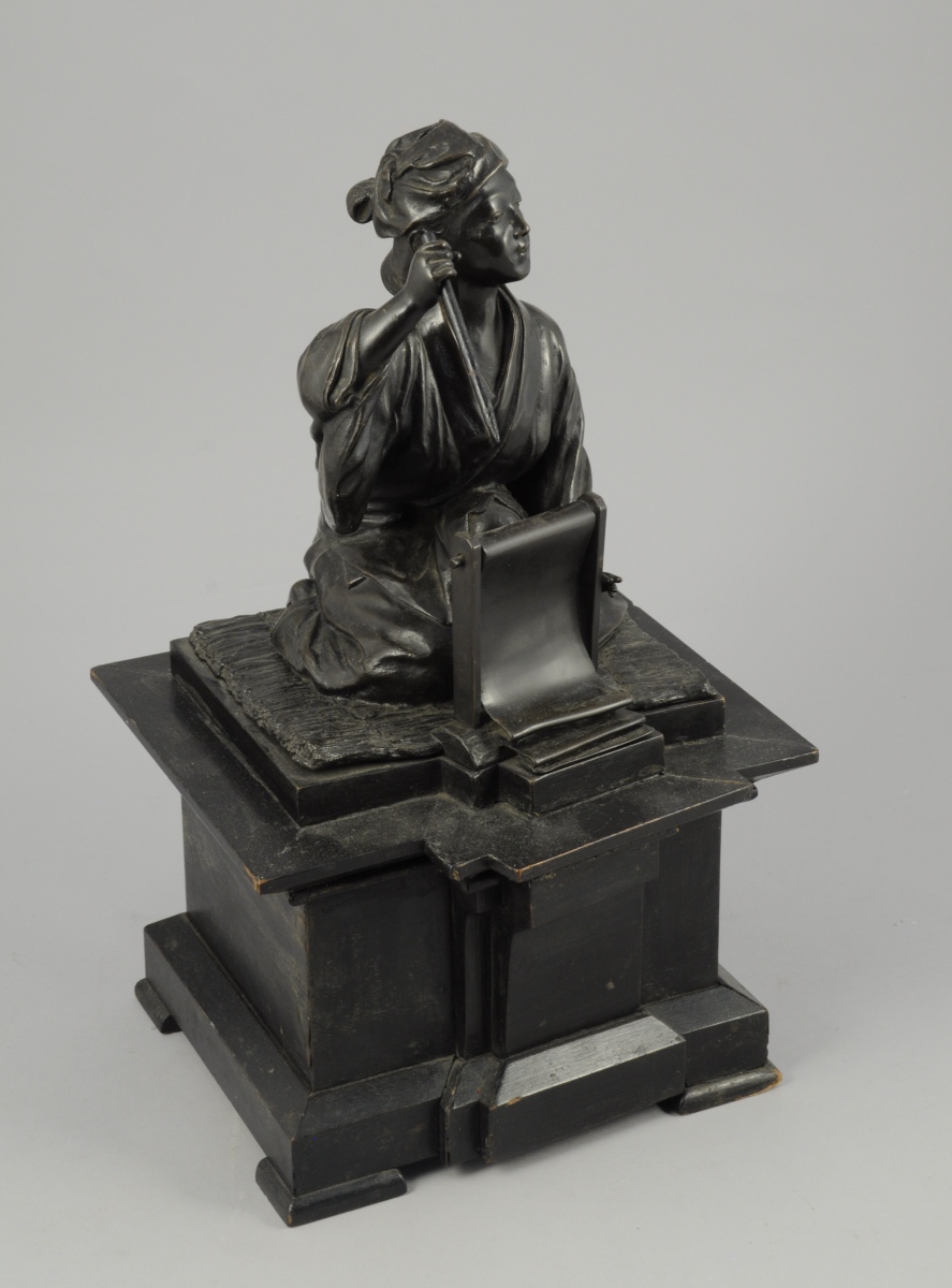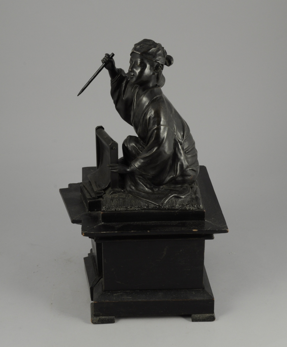 JAPON. PEINTRE ACCROUPI, en bronze à patine brune sur un socle en bois. XIXe.