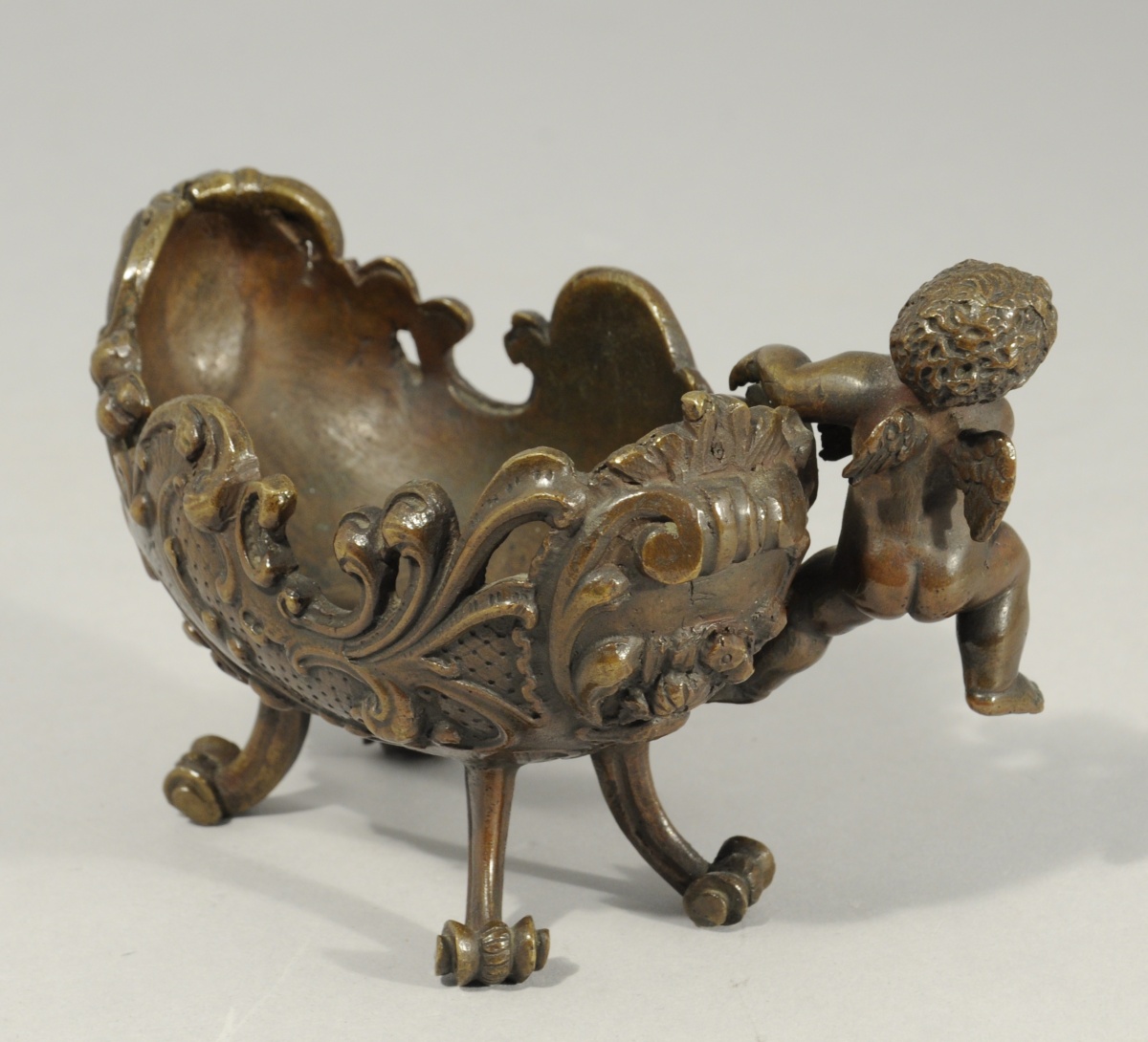Petite COUPE de forme navette en bronze patiné. Le réceptacle à bords contournés à décor de style Louis XV d'enroulements feuillagés, agrafes, fleurs et quadrillages agrémenté d'un amour en ronde-bosse. Elle repose sur quatre pieds à enroulements. Signée "A. PANDIANI MILANO".