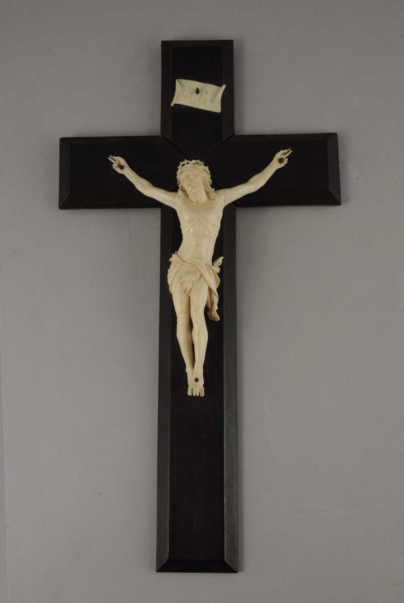 CRUCIFIX. Le Christ couronné d'épines et le phylactère en ivoire sculpté. Croix en bois noirci.