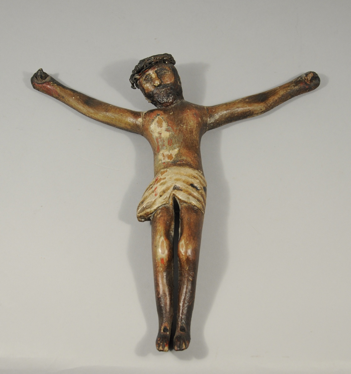 CHRIST en bois sculpté et peint. La couronne d'épines en fil de fer.