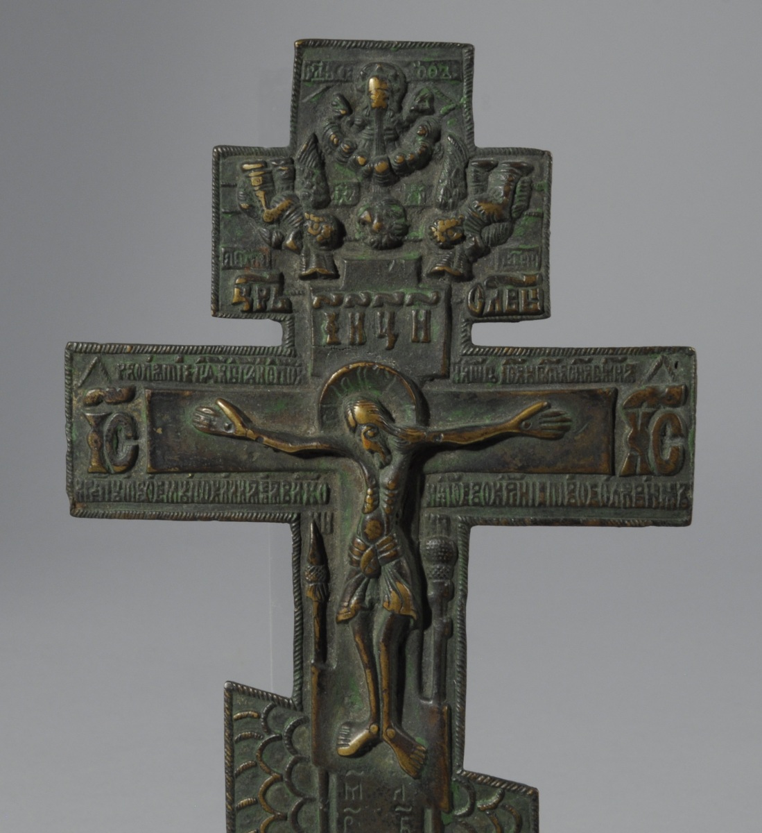 CRUCIFIX en bronze. Travail russe ancien. Haut. 19,5 Larg. 11,5 cm.