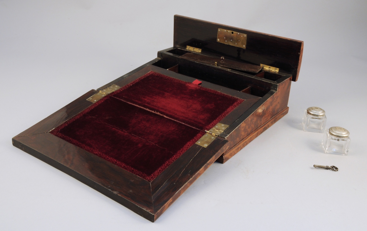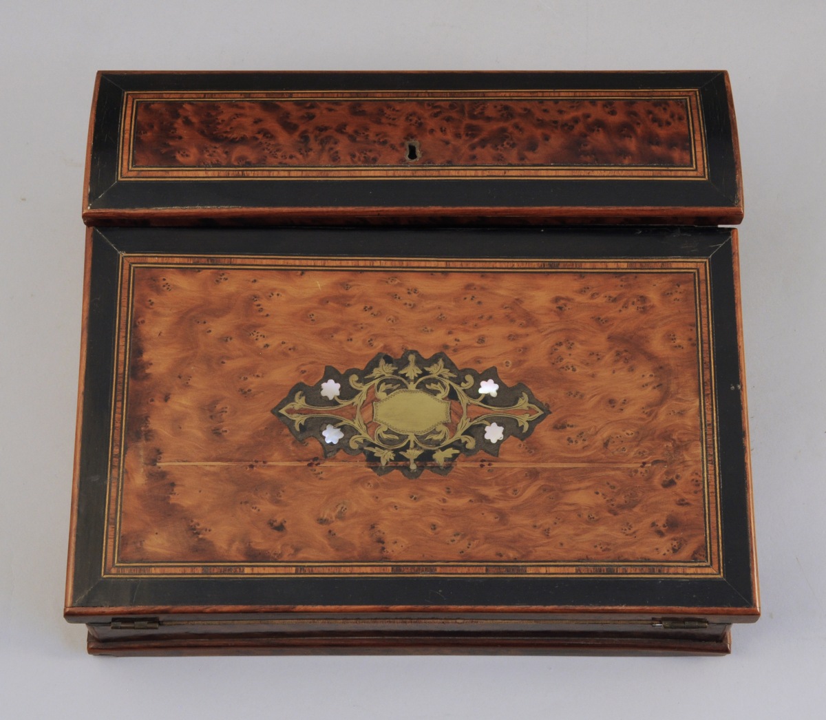 ÉCRITOIRE de forme rectangulaire ouvrant à deux abattants en placage de loupe de thuya, d'ébène, de palissandre et filets de bois clair. Orné d'un cartouche en marqueterie de laiton et de nacre. Avec ses deux godets en verre et leur couvercle en métal argenté.
