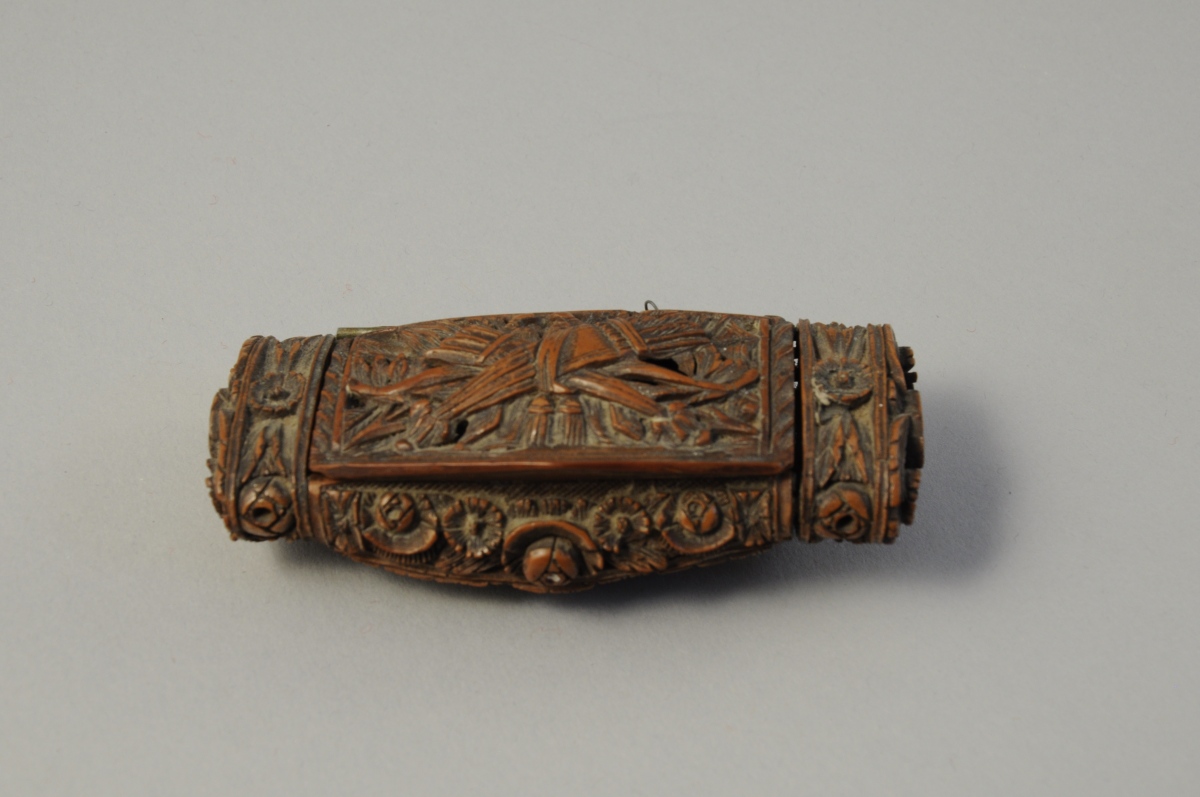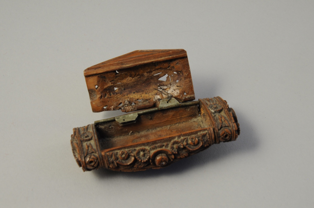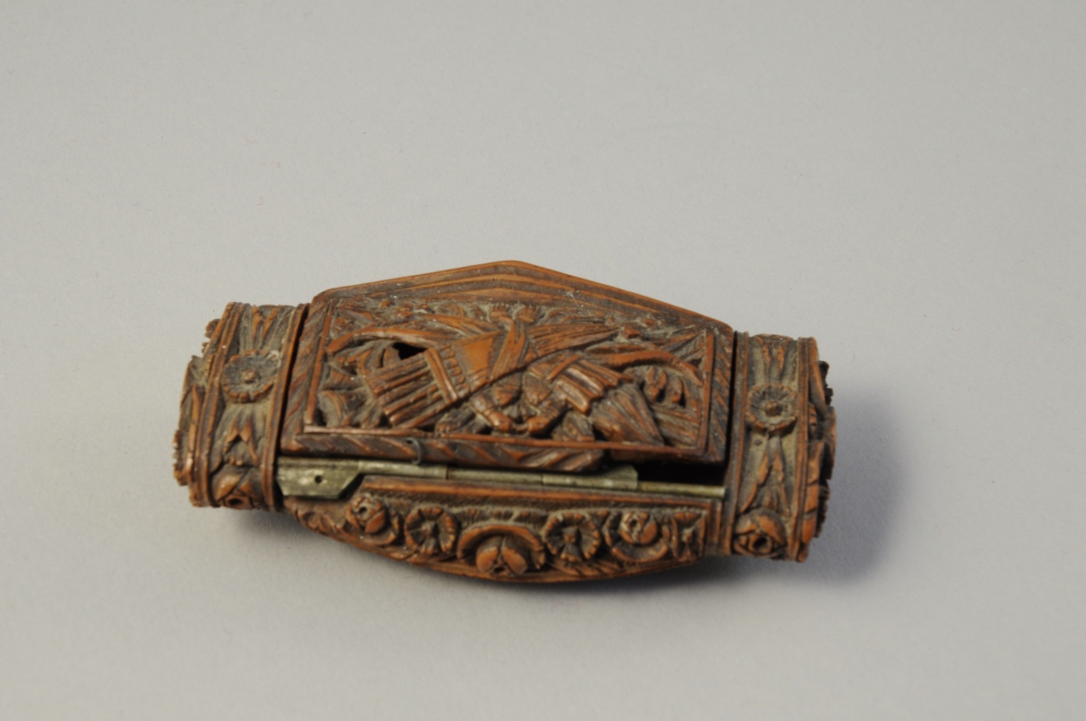 TABATIÈRE en corrozo: couvercle aux carquois et pigeons se becquetant - dos à la rencontre d'un couple. XVIIIe. Long. 8,5 Larg. 3,5 cm. XIXe. (accdt. charnière)