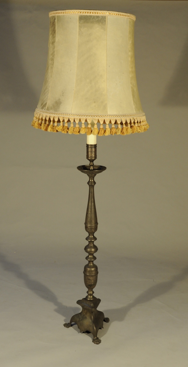 PIQUE-CIERGE en étain. Le montant tourné. Piètement tripode.