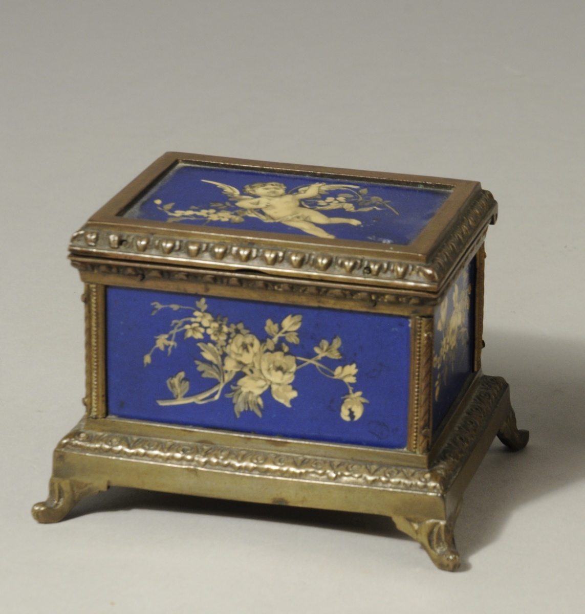 JOINT: COFFRET de forme rectangulaire en bronze à décor de frises feuillagées et panneaux de tôle laqués bleu ornés de bouquets floraux et angelot en grisaille. L'intérieur gainé de bois. Repose sur quatre pieds cambrés.