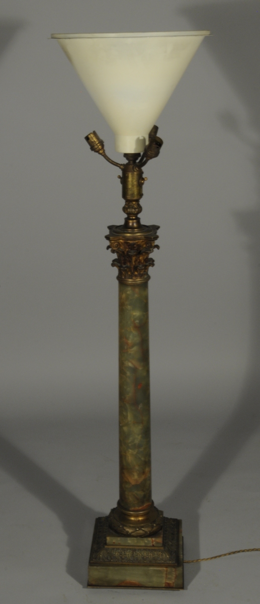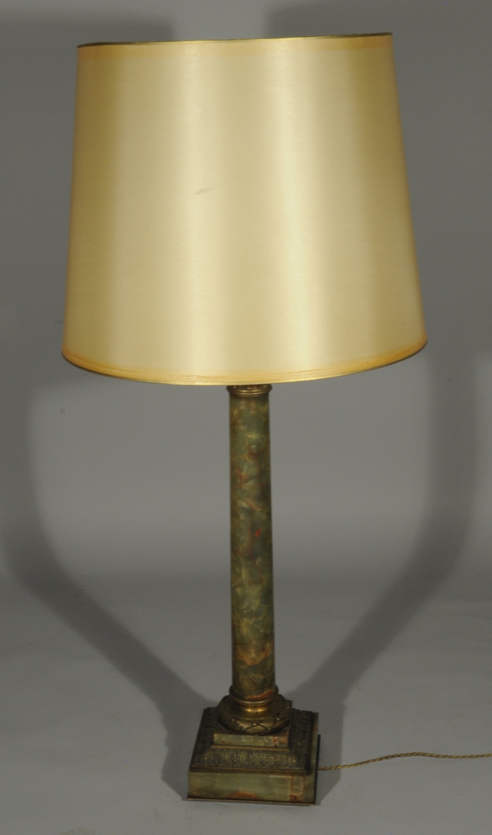 LAMPE à quatre lumières adoptant la forme d'une colonne corinthienne en onyx vert agrémenté d'éléments en bronze doré tels que chapiteau, base en tore de laurier et frise feuillagée. Socle carré en bronze. Repose sur quatre petits pieds boule.