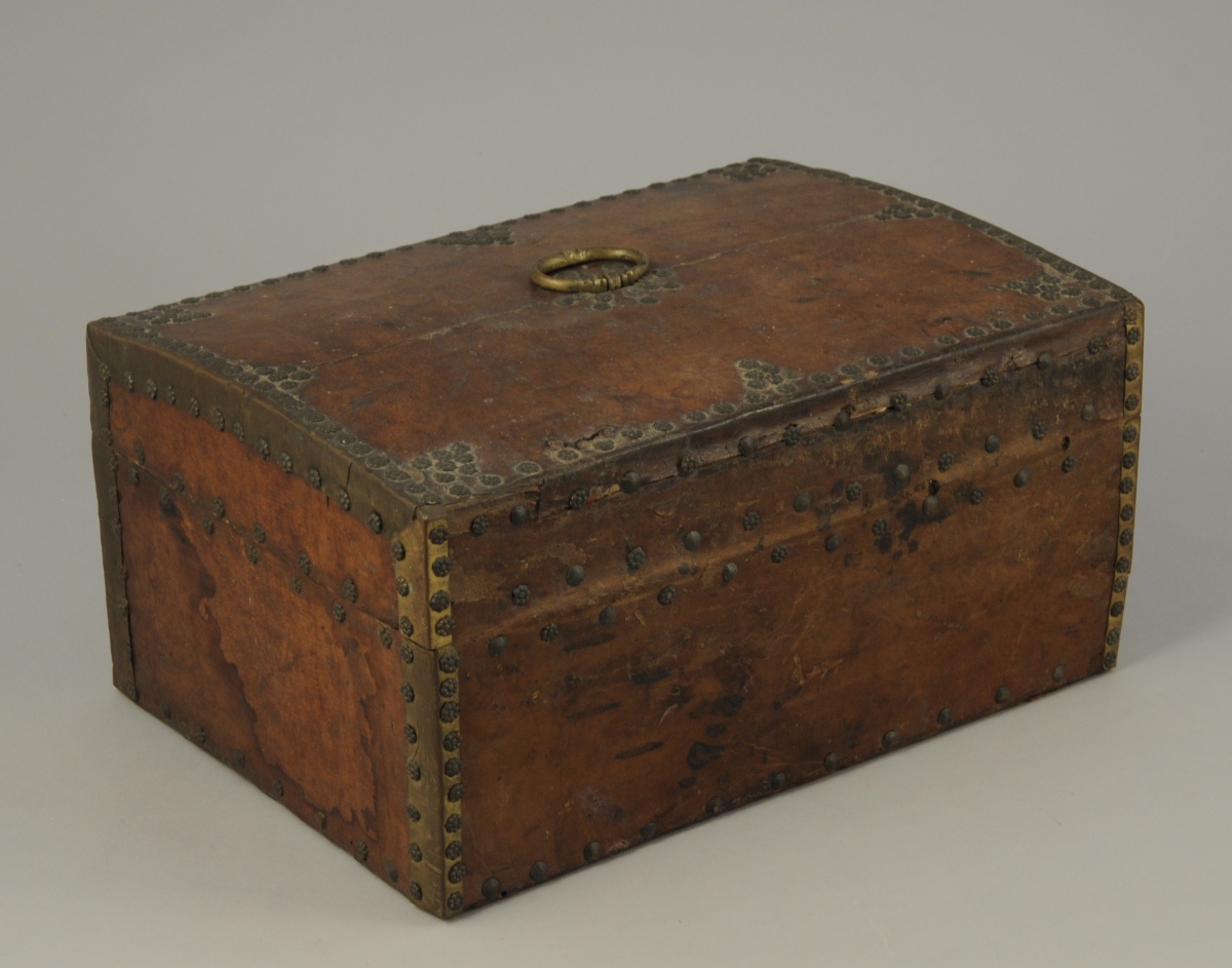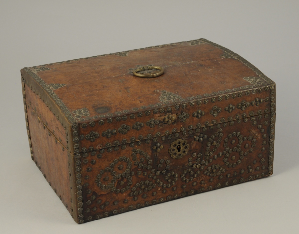 COFFRET de forme rectangulaire à couvercle légèrement arrondi gainé de cuir fauve. Décor de clous bombés ou en forme de rosettes. Une petite poignée au centre du couvercle.