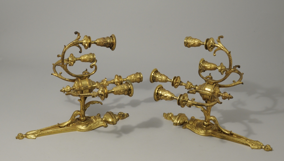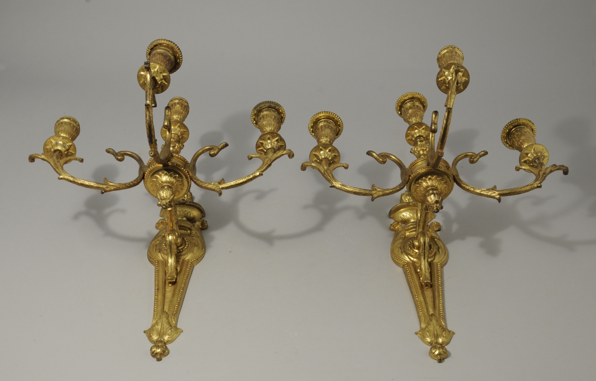 PAIRE D'APPLIQUES à quatre feux en bronze doré. Trois bras de lumières en volute, le quatrième sur fût à l'amortissement. Décor de feuilles d'acanthe stylisées, fleurons, graines, cannelures et rais de perles. Un pot-à-feu à l'amortissement.