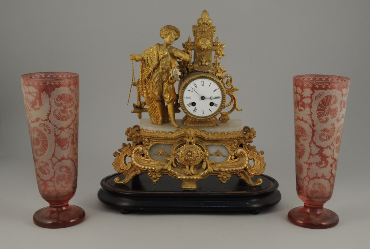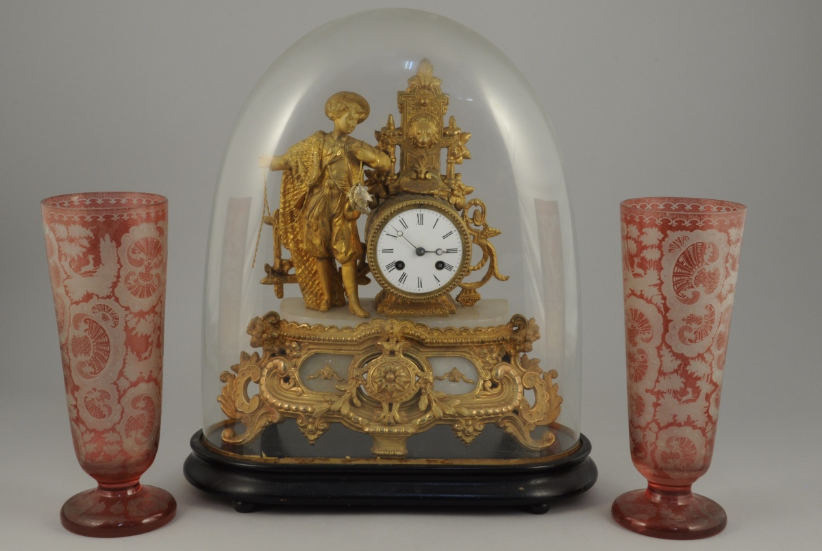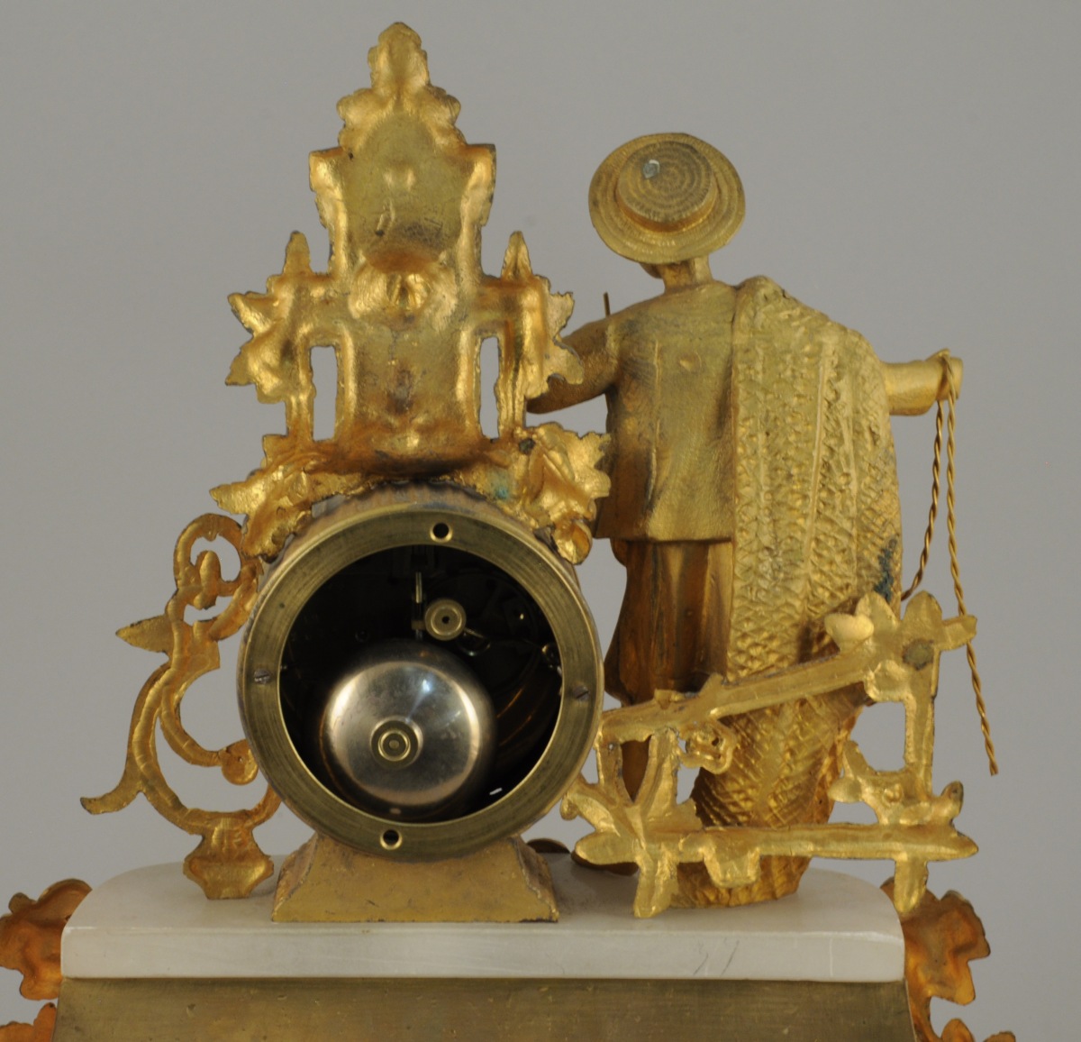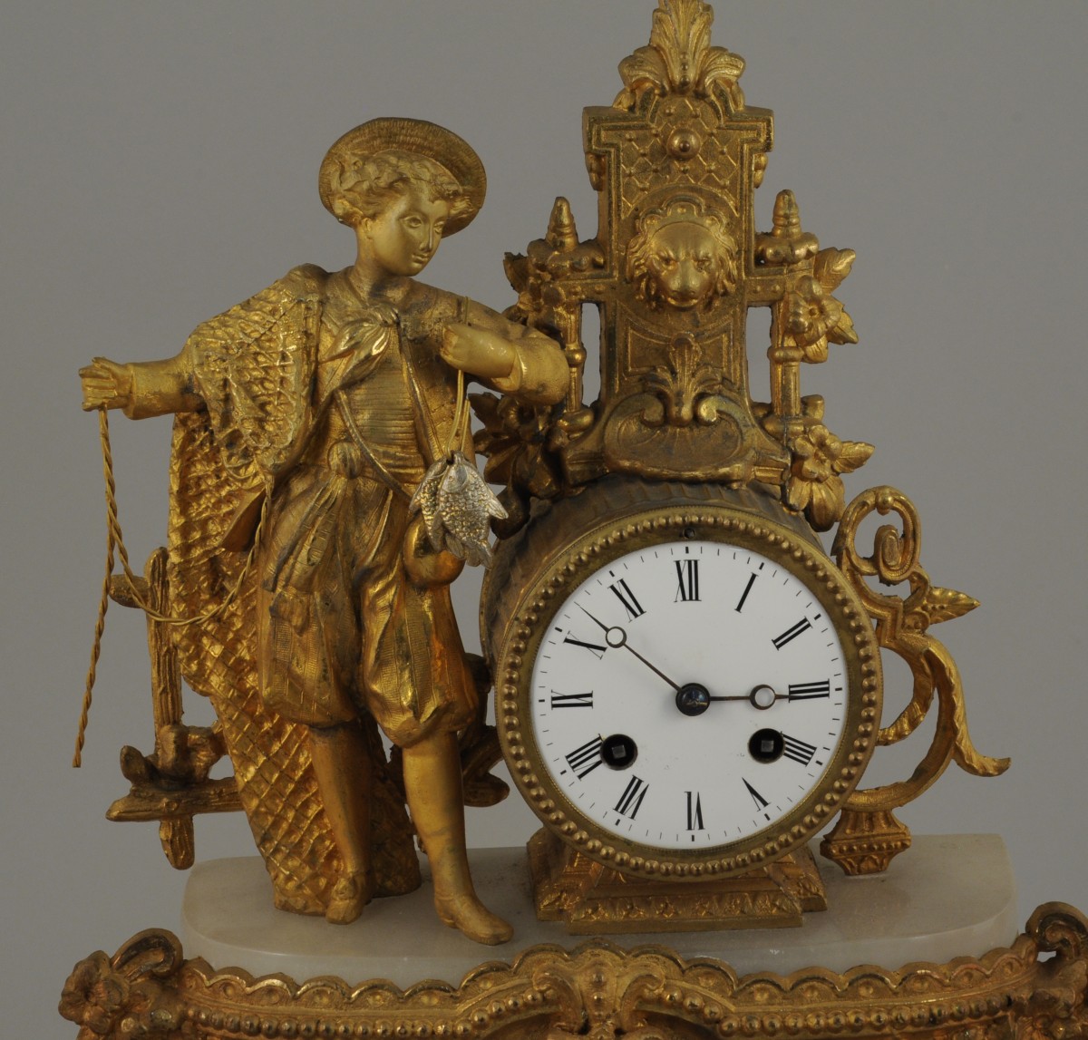 - PENDULE en régule et albâtre figurant un petit pêcheur sur une console mouvementée. Cadran émaillé blanc indiquant les heures en chiffres romains et gradué pour les minutes. Sur un socle en poirier noirci avec son globe de verre.