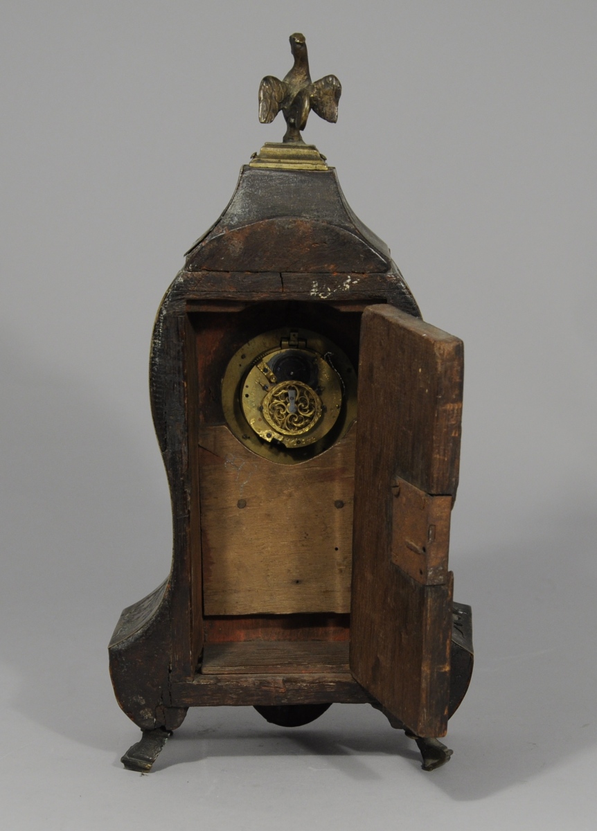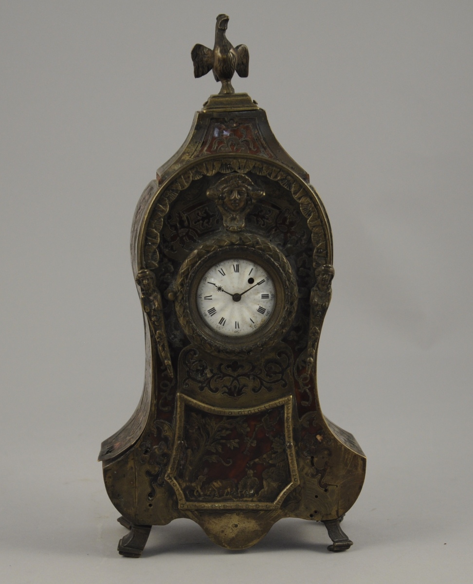 Petite PENDULE en marqueterie Boulle, laiton et écaille. Décor, dans des encadrements de rinceaux feuillagés, d'un pâtre jouant de la flûte pour ses moutons et son chien en façade et d'un coq juché sur une boule pour les côtés. Garniture de bronzes telle que masque féminin, cariatides, frise de coquilles et coq à l'amortissement. Cadran godronné émaillé blanc indiquant les heures en chiffres arabes et les cinq minutes en chiffres romains. Mouvement à coq signé "Docagne. horg / au Havre" et numéroté 341. Repose sur quatre pieds à pans coupés.