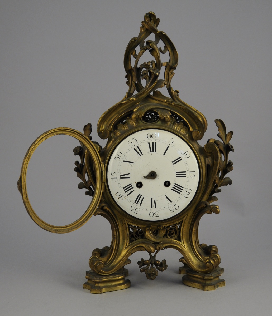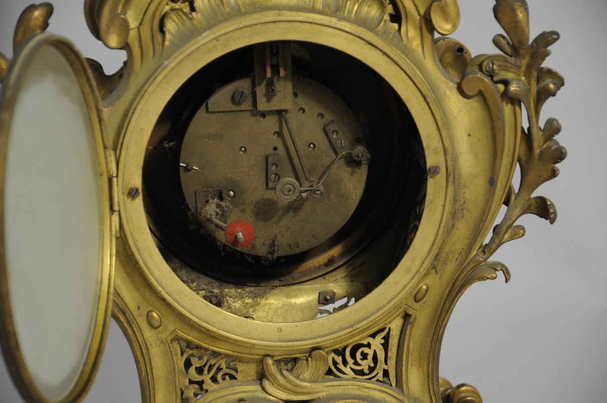 PENDULE en bronze ciselé et doré. Riche décor ajouré de volutes feuillagées, fleurs et enroulements. Piètement quadripode. Le mouvement marqué J.E.D. Clef.