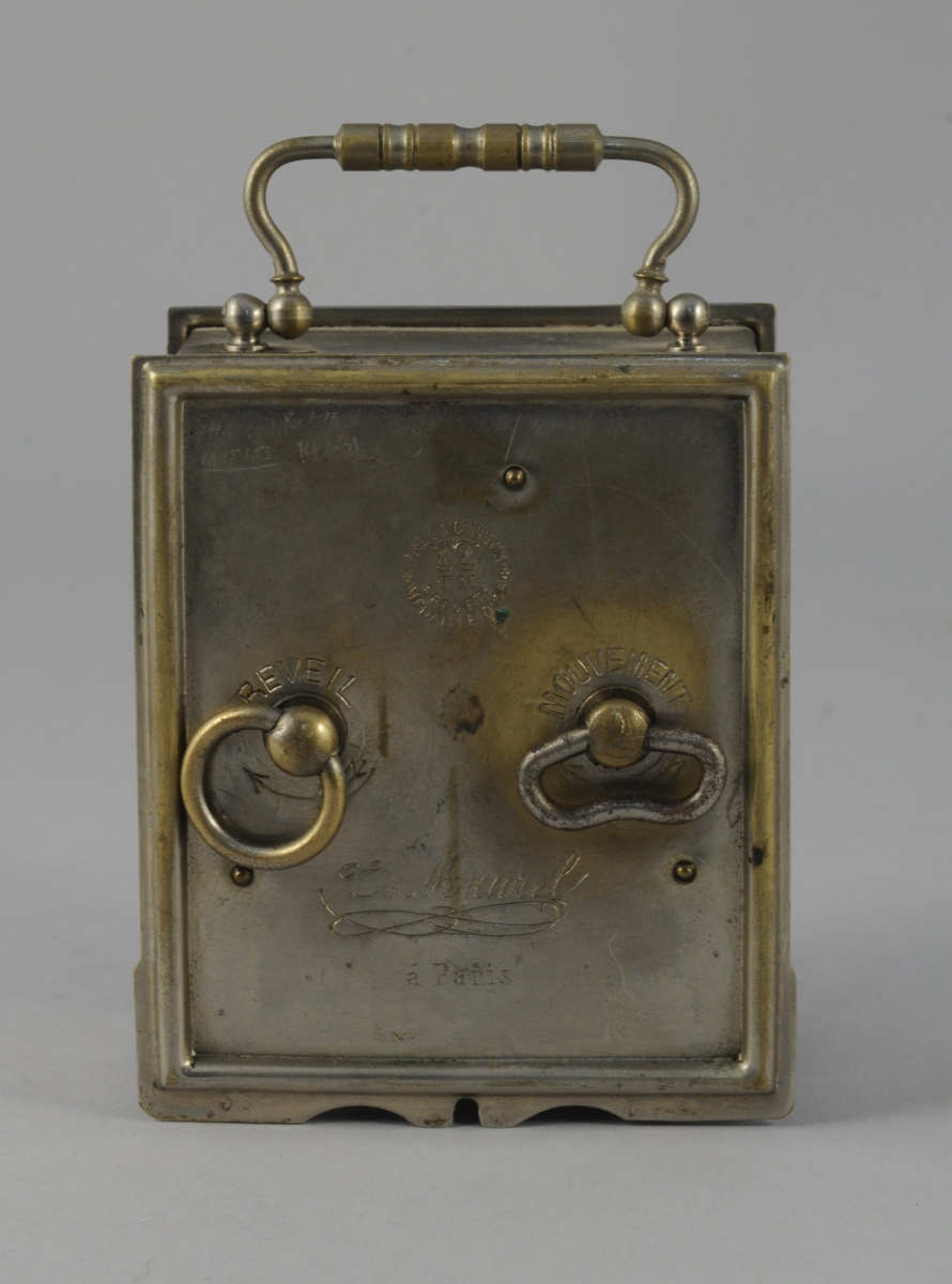 PENDULETTE D'OFFICIER en métal argenté. Cadran émaillé blanc, indiquant les heures en chiffres romains et les minutes en chiffres arabes. Réveil. Signée "C. Maurel à Paris" et marquée "Prix Montyon / TM / Breveté / Médaille d'or".