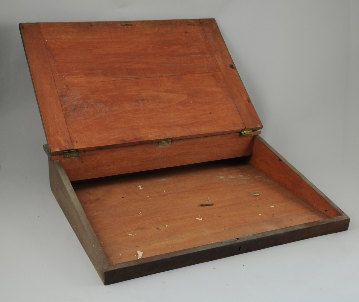 Deux PUPITRES en bois garni de cuir. Abattant découvrant des encriers (dont un en verre) et une cavité.