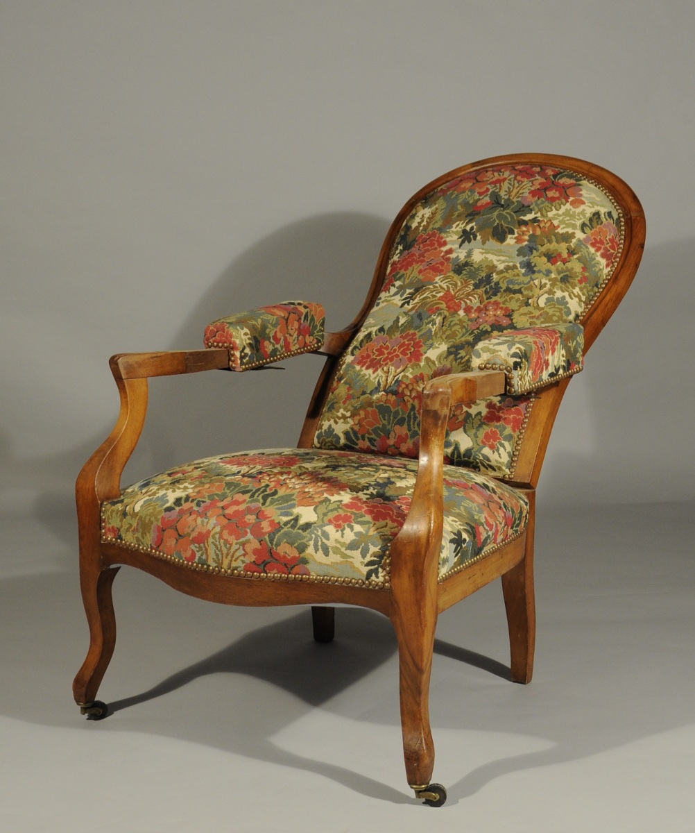 - FAUTEUIL dit "voltaire" à dossier basculant en noyer mouluré. Il repose sur quatre pieds, les pieds antérieurs galbés à roulettes.