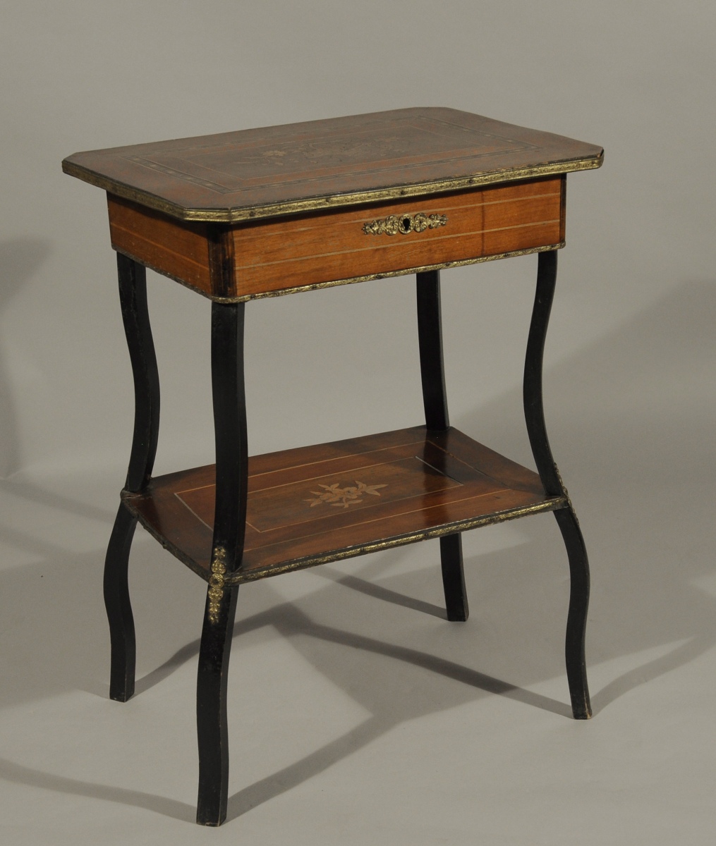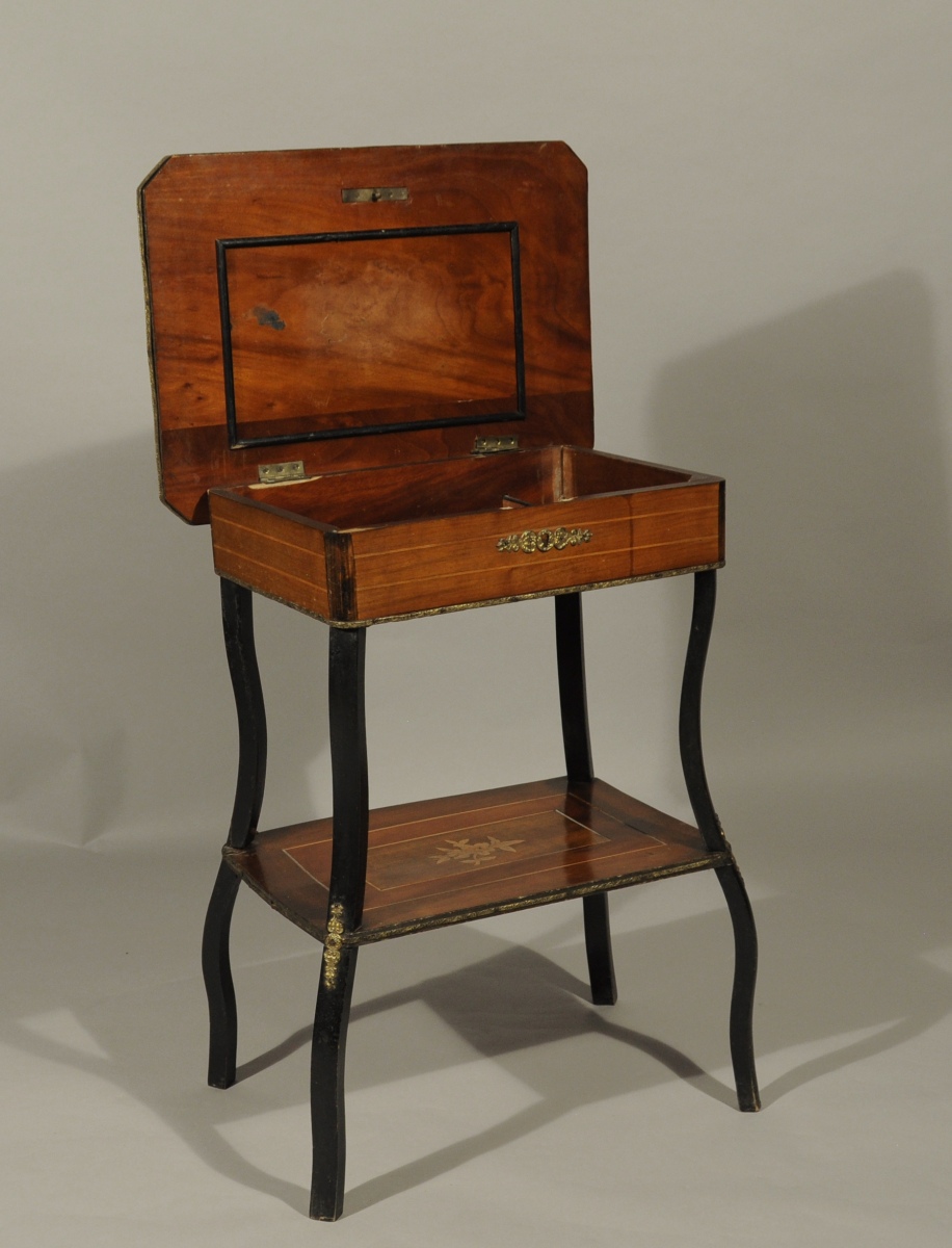 TABLE TRAVAILLEUSE en marqueterie. Elle ouvre sur le dessus par un plateau rectangulaire, découvrant un grand casier flanqué de deux plus petits. Elle repose sur quatre pieds galbés avec un plateau rectangulaire en entretoise. Décor incrusté de panier à fleurs inséré dans un encadrement. Garniture de bronzes: entrée de serrure, chutes et lingotières.