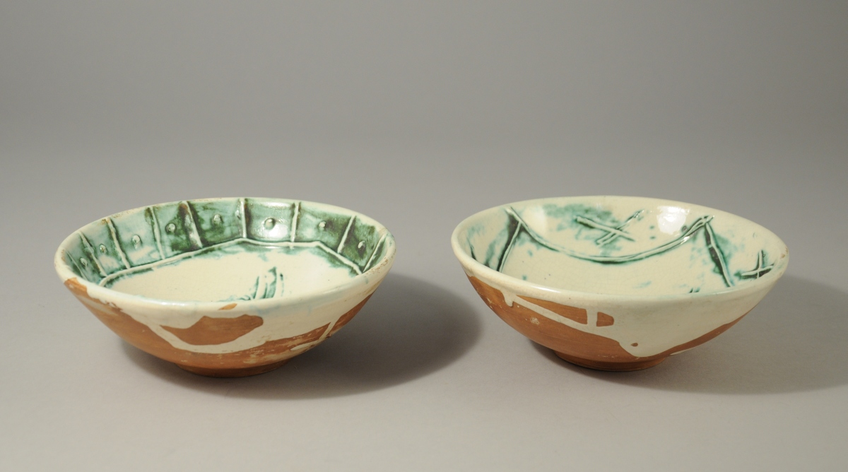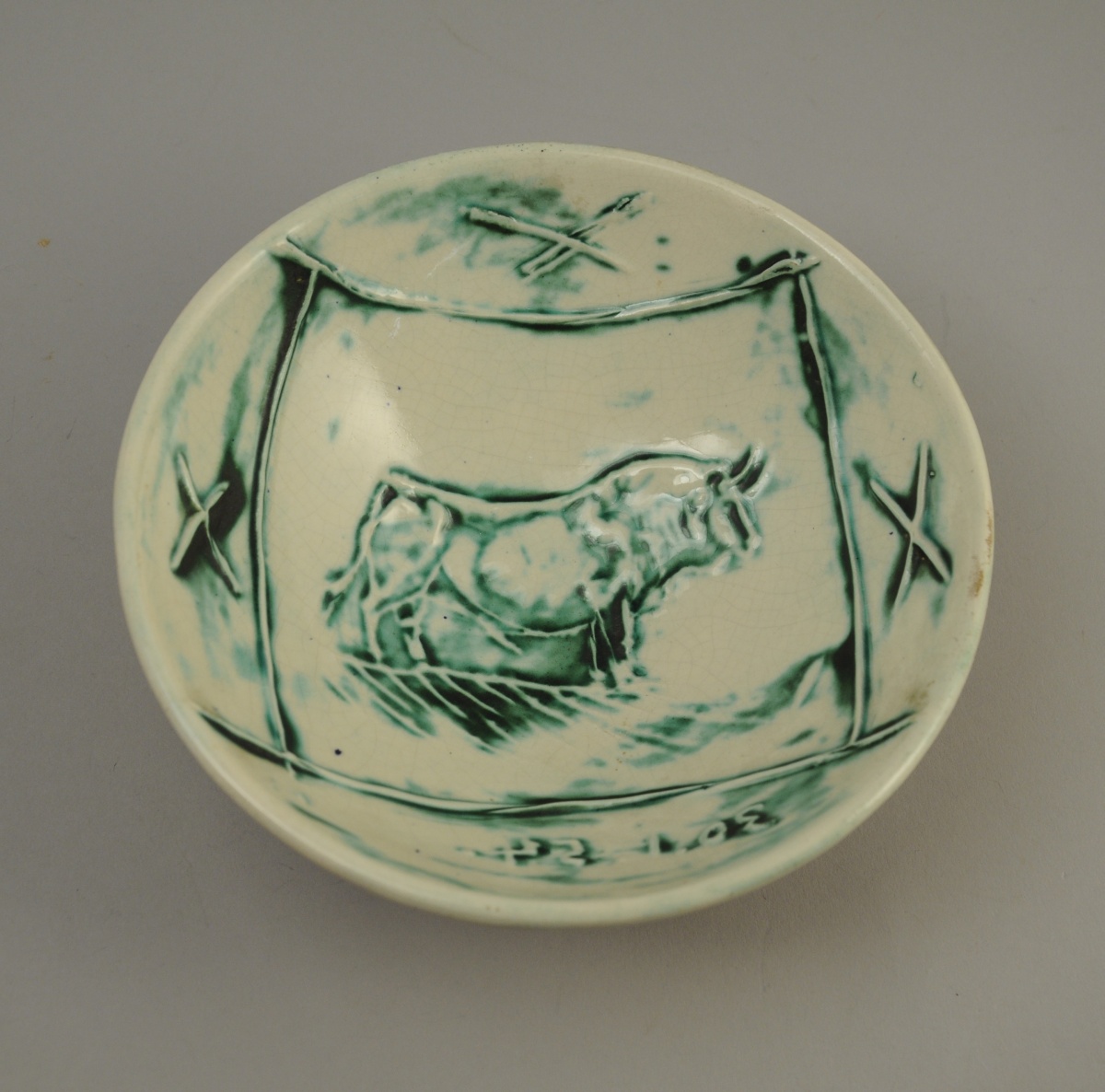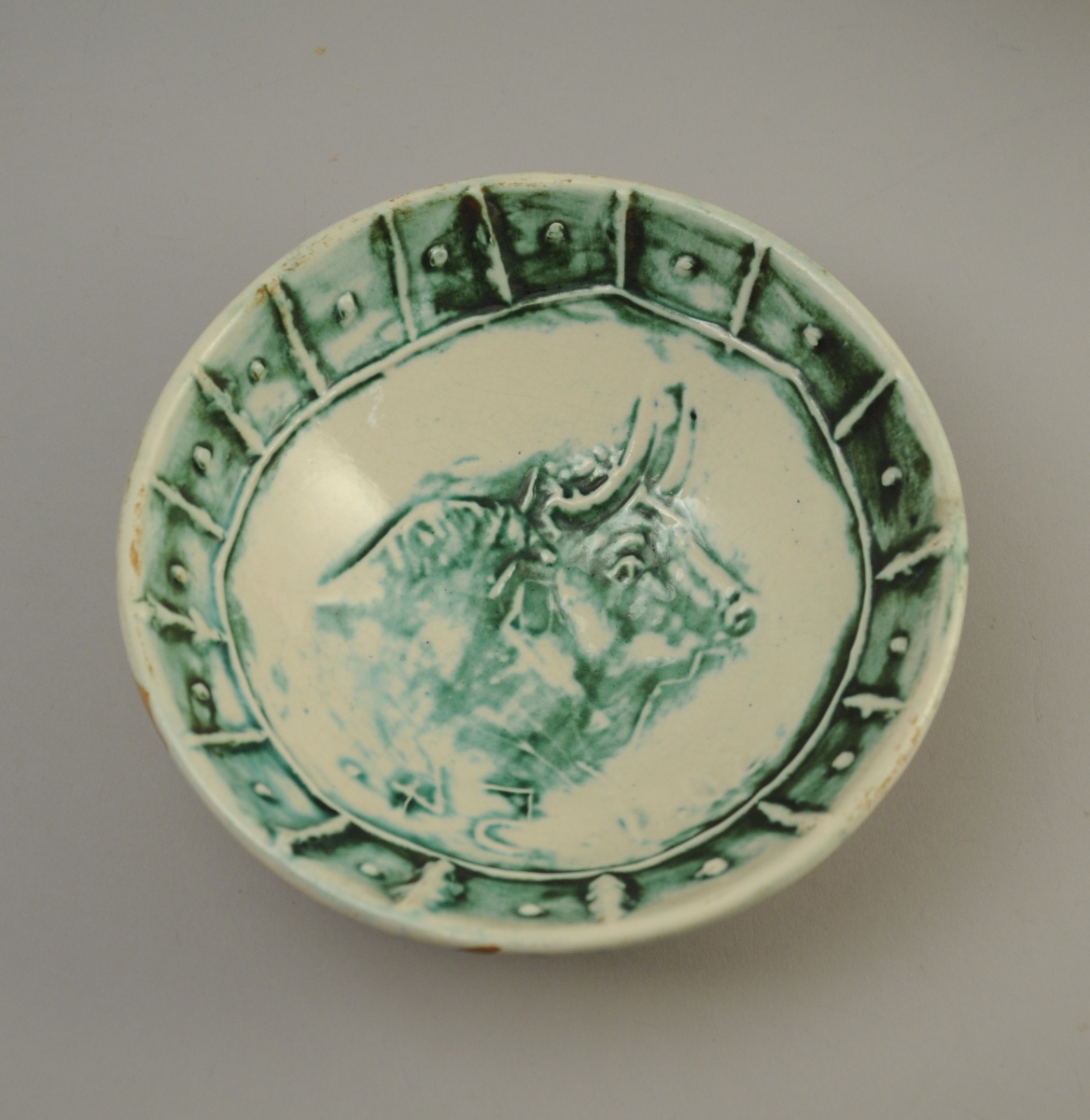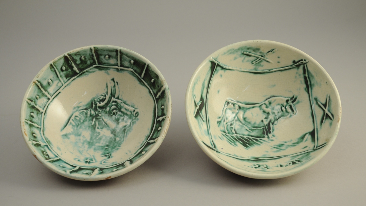 Paire de coupelles rondes en céramique de MADOURA, à décor de taureaux. Datées 30.1. 54 et 54 et marquées "Madoura plein feu / Empreinte originale de Picasso".