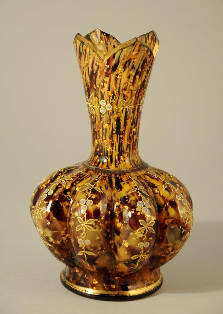 CLICHY? VASE à panse godronnée et haut col quadrilobé en verre moucheté jaune, brun et rouge agrémenté de paillettes d'or. Décor émaillé or argent de motifs floraux stylisés.