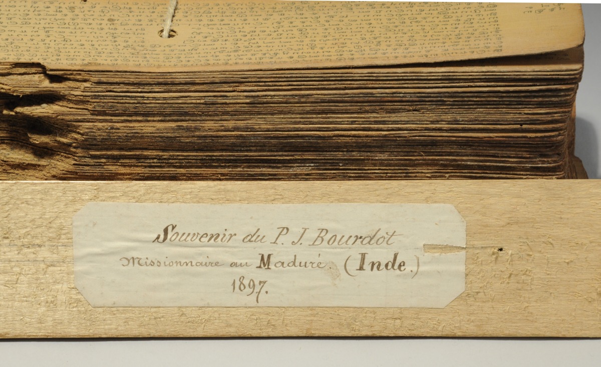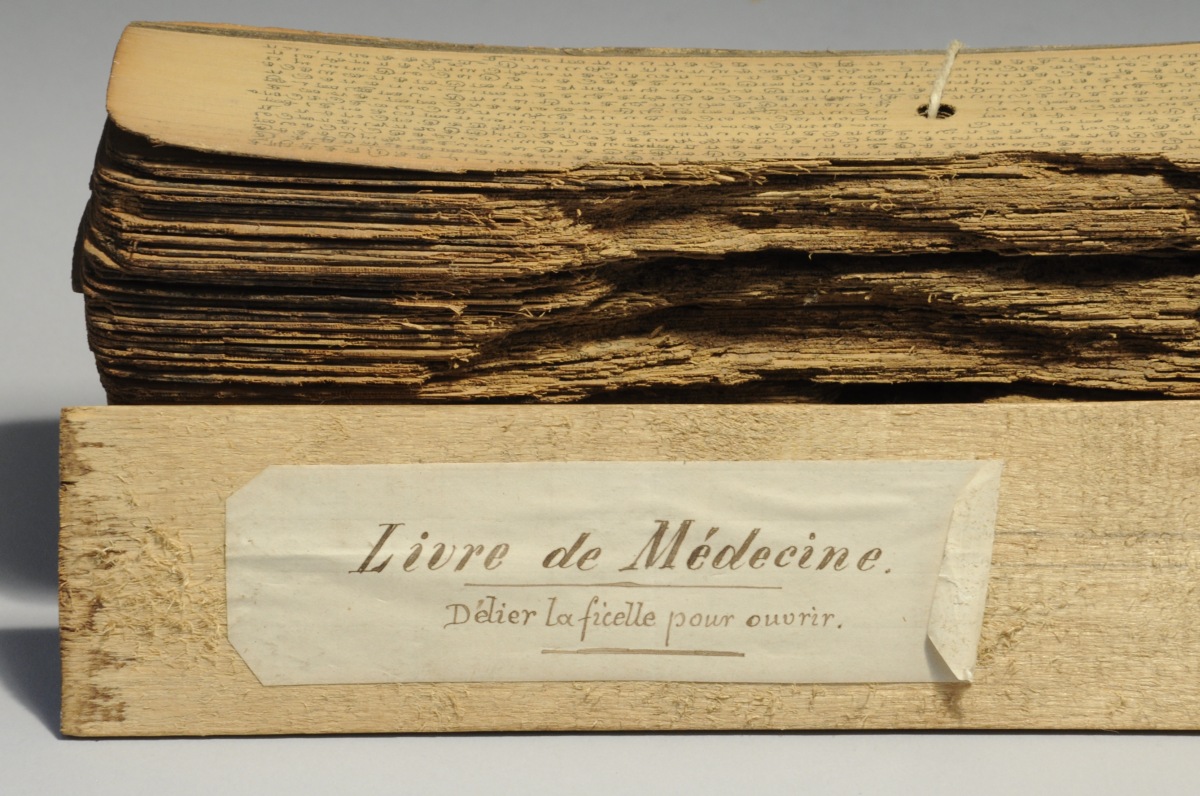 BIRMANIE. LIVRE DE PRIÈRES sur plaquettes de bambou, étiquettes : "Livre de médecine. / Délier la ficelle pour ouvrir." et "Souvenir du P.J. Bourdot / Missionnaire au Maduré (Inde.) / 1897." Dans sa boîte.