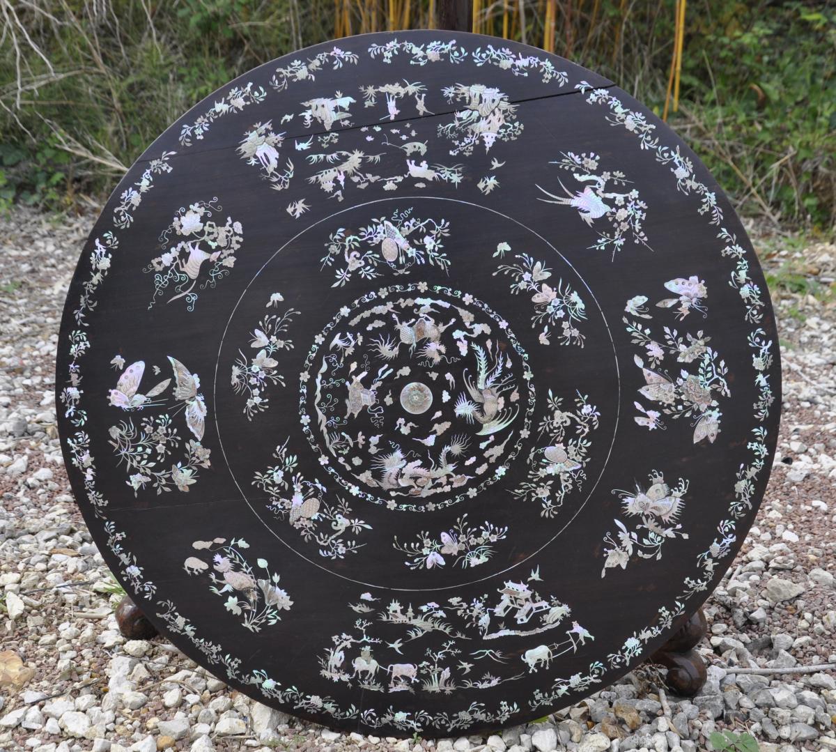 INDOCHINE. GUÉRIDON tripode en bois sculpté. Le plateau rotatif de forme circulaire richement incrusté de scènes paysagées, papillons, motifs végétaux et créatures fabuleuses. Pieds cambrés sculptés et ajourés d'un dragon enserrant la perle sacrée et de feuillages stylisés.