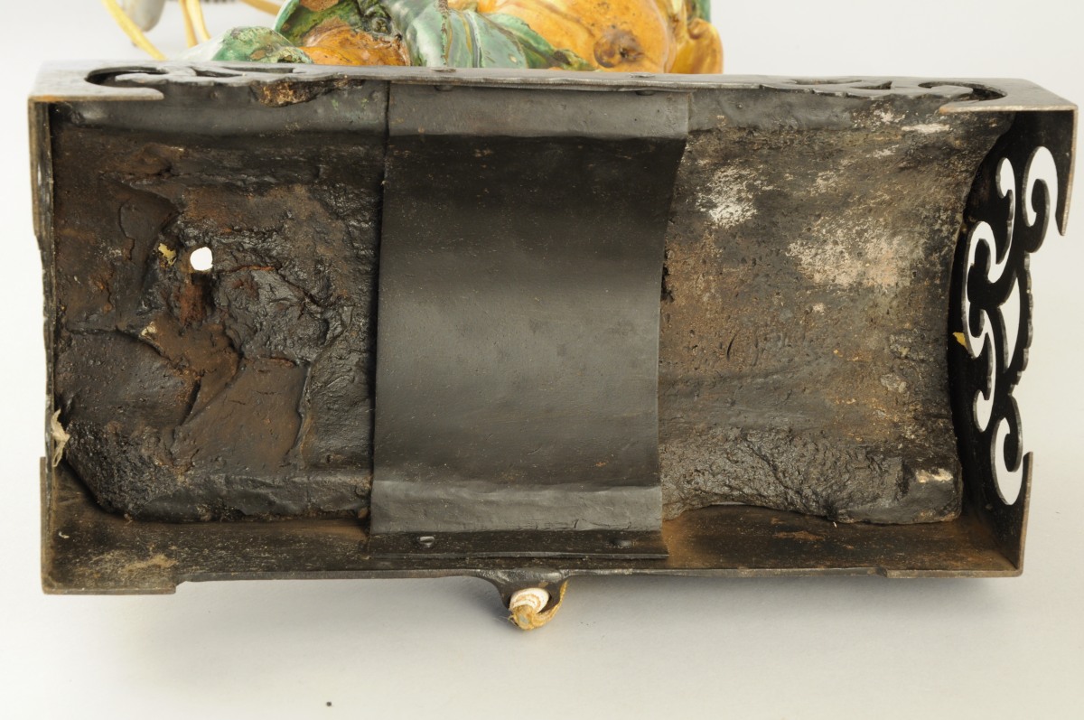 CHINE. TUILE FAÎTIERE en céramique vernissée polychrome figurant un guerrier. Monté en lampe sur un socle de fer forgé marqué "New York City".