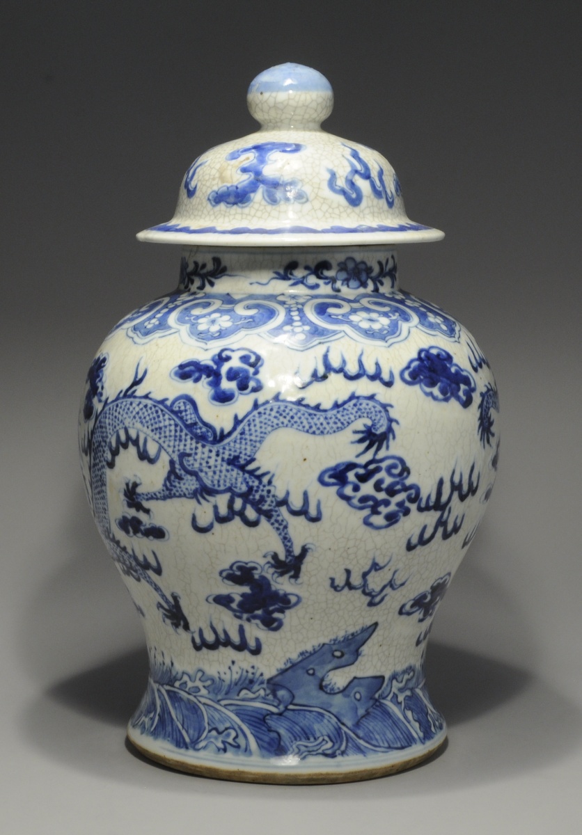 CHINE. VASE COUVERT de forme balustre en porcelaine à décor émaillé bleu de dragons. Fond craquelé. Marque apocryphe Kangxi, fin XIXe.