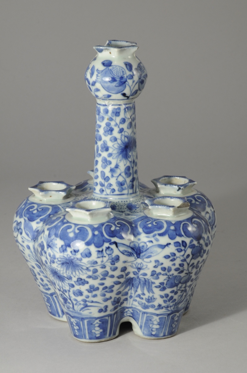 CHINE. TULIPIÈRE en porcelaine à décor floral bleu et blanc. Six orifices. XIXe.