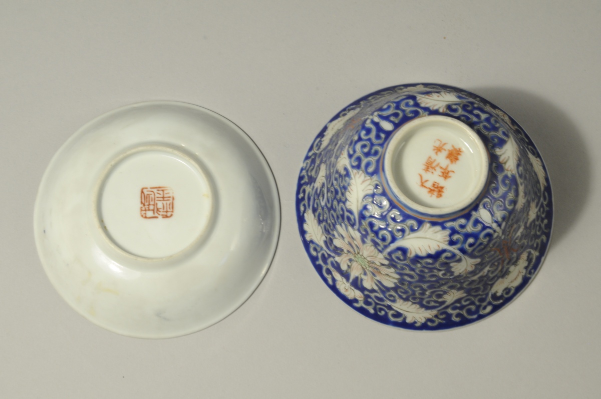 CHINE. BOL COUVERT et sa SOUS-TASSE en porcelaine à décor polychrome de fleurs, rinceaux et idéogrammes sur fond bleu. Cachet.