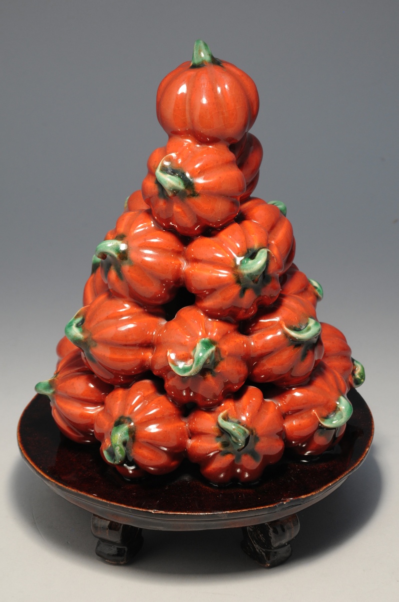 CHINE. PAIRE DE PILES DE TOMATES en porcelaine émaillée corail et vert pour les tiges. Chaque pile est constituée de 21 tomates disposées en pyramide. Socle adhérent émaillé brun reposant sur cinq pieds (un rapporté).
