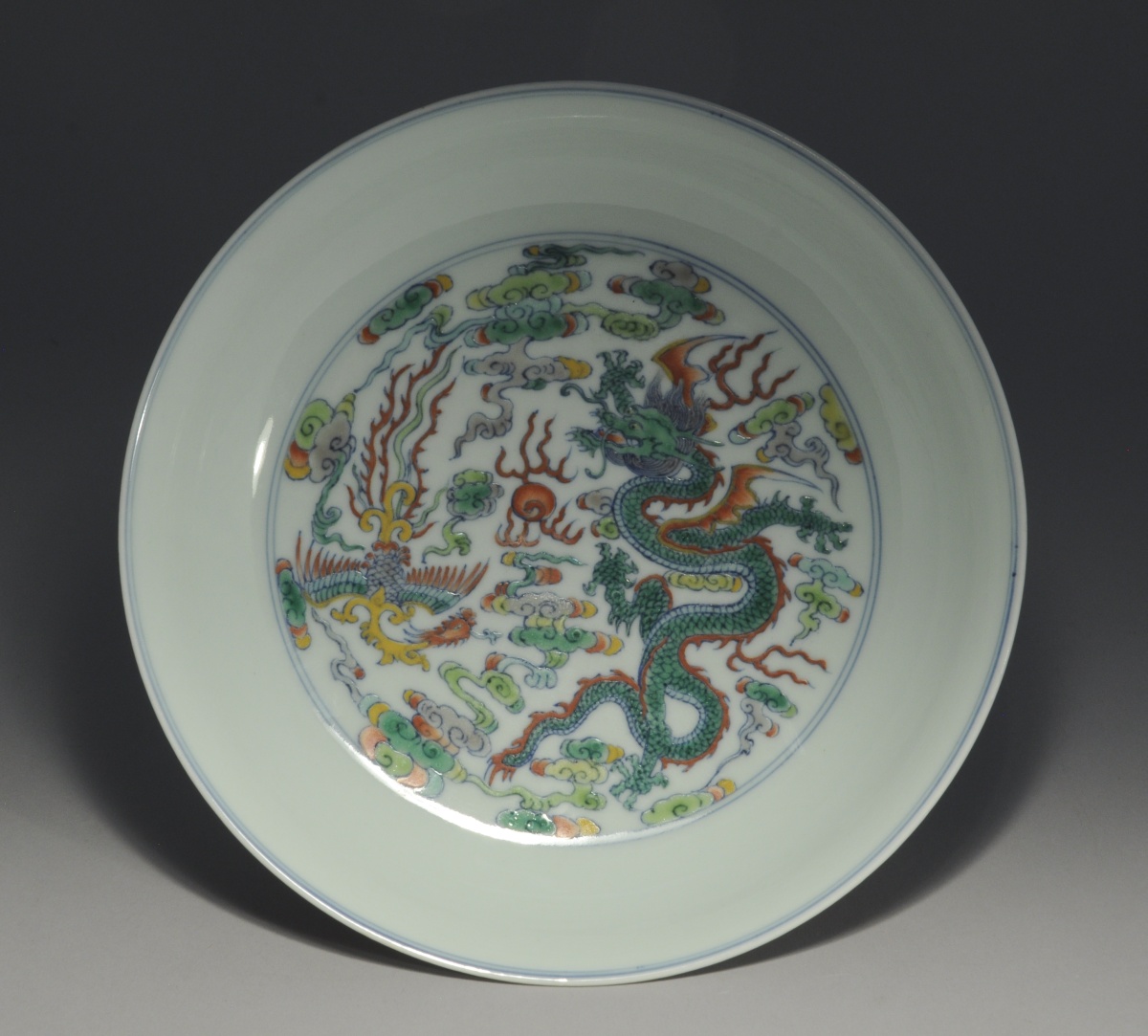 CHINE. PLAT en porcelaine polychrome à décor de dragons et phénix.