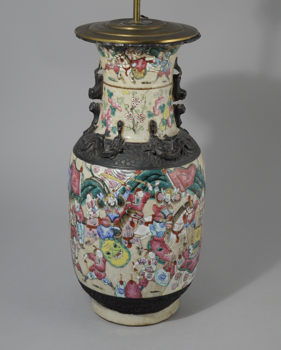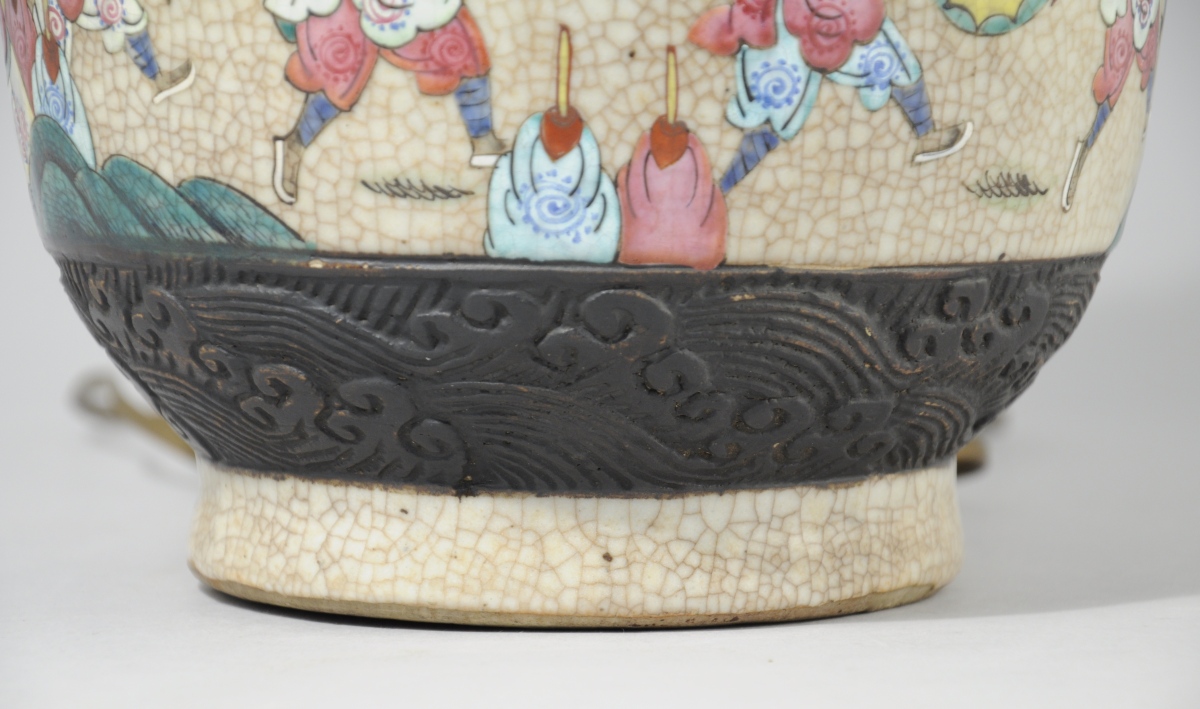 CHINE. VASE balustre en porcelaine craquelée à décor polychrome de scènes de bataille. Cachet sous la base.