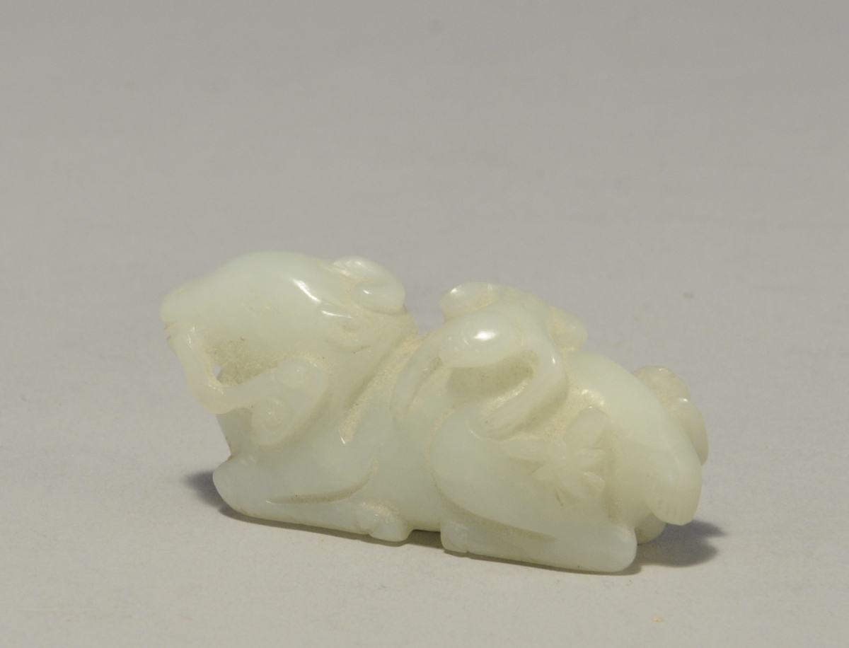 CHINE. GROUPE en néphrite céladon, singe, libellule et chauve-souris sur le dos d'un bouc, tenant entre ses dents un champignon lingzhi.