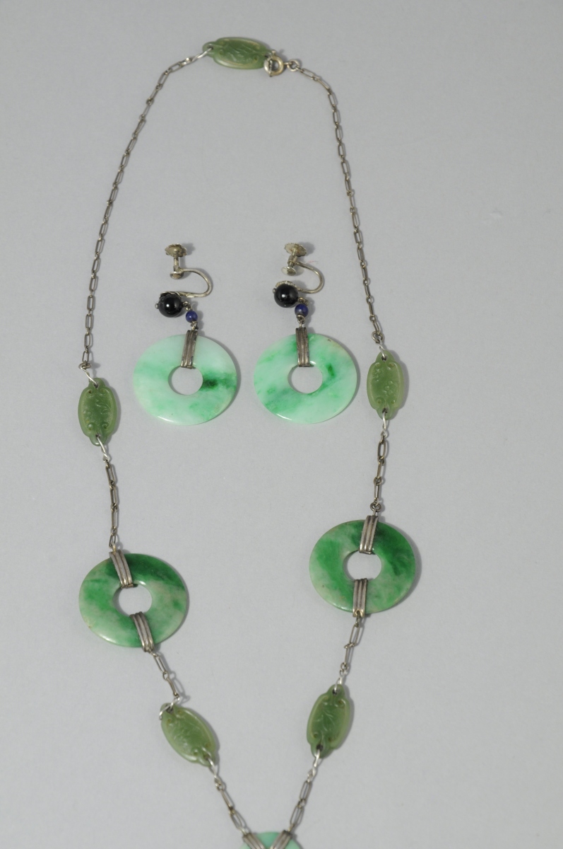 CHINE. PARURE EN JADEITE: PENDENTIF de forme ronde ajouré de motifs feuillagés et de deux personnages et paire de BOUCLES D'OREILLES.