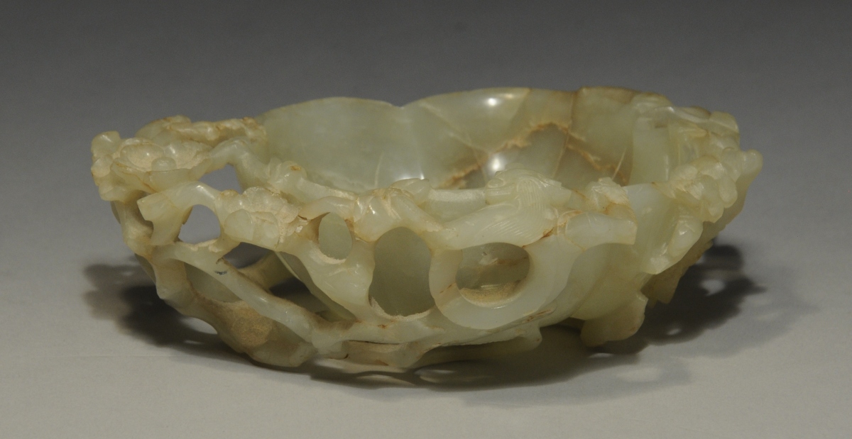 CHINE. LAVE-PINCEAUX en forme de fleur en néphrite à décor sculpté et détaché de branches de prunier fleuries et d'un qilong sur le rebord de la coupe.