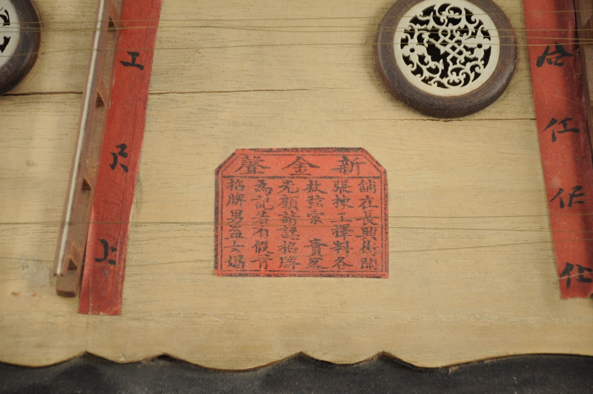 CHINE. INSTRUMENT DE MUSIQUE à cordes. Caisse oblongue de forme chantournée ouvrant en façade par un petit tiroir recelant un marteau de laiton. Le couvercle laqué or sur fond noir d'un texte et, dans une réserve, d'un rocher et de bambous sur fond quadrillé à fleurs.