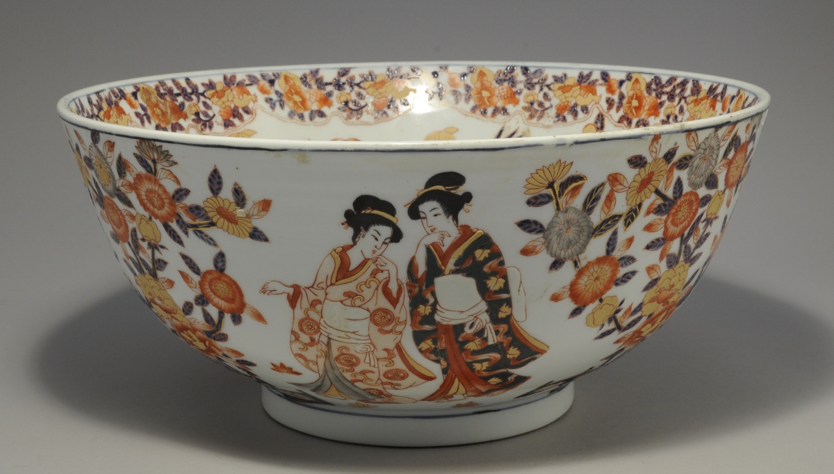 JAPON. Grande COUPE en porcelaine polychrome et or, à décor de femmes à l'éventail.