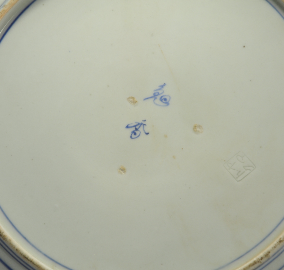 JOINT: JAPON. Grand PLAT de forme circulaire en porcelaine à décors émaillé de dames de cour prenant une collation dans un jardin, l'aile ornée d'un treillage et de quatre médaillons fleuris. Marques olographes et cachet creux au dos. XXe. Diam. 40 cm.