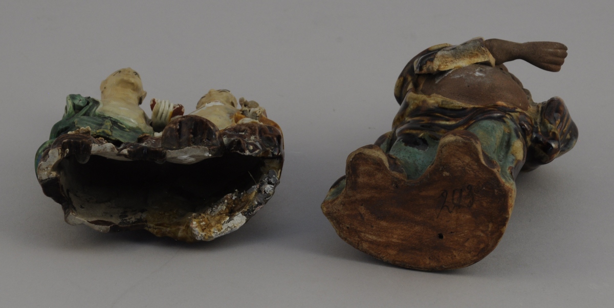 - Deux personnages sur une souche. Chine, Kangxi. Haut. 12, Larg. 9,5 cm. (nombreux accidents, têtes restaurées, probablement européennes)