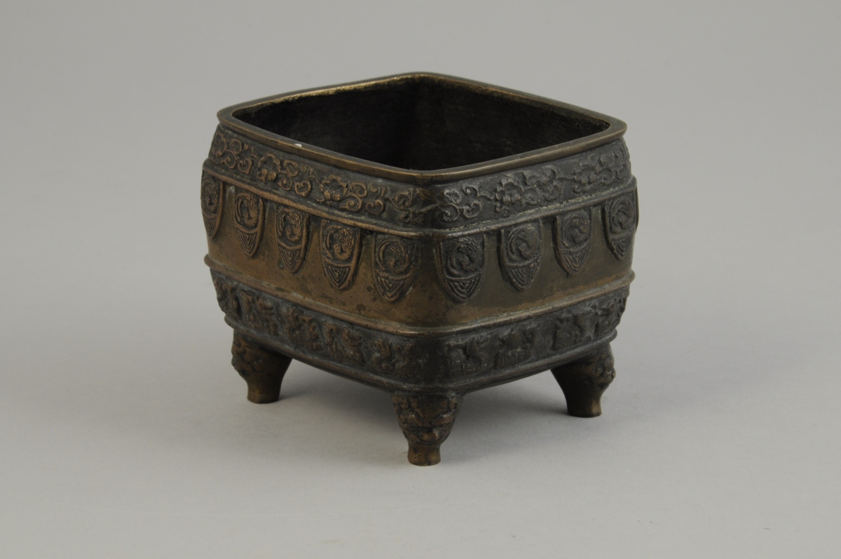 JAPON. BASSIN en bronze de forme rectangulaire décoré en bas-relief de frises de rinceaux et d'oiseaux inscrits dans des cartouches, reposant sur quatre pieds ornés de masques. Marqué à l'encre 414.