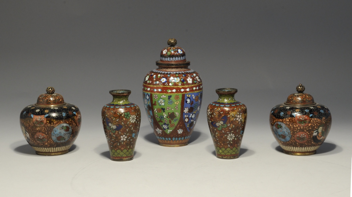 JAPON. CINQ PIÈCES en émaux cloisonnés à décor floral sur fond pailleté: