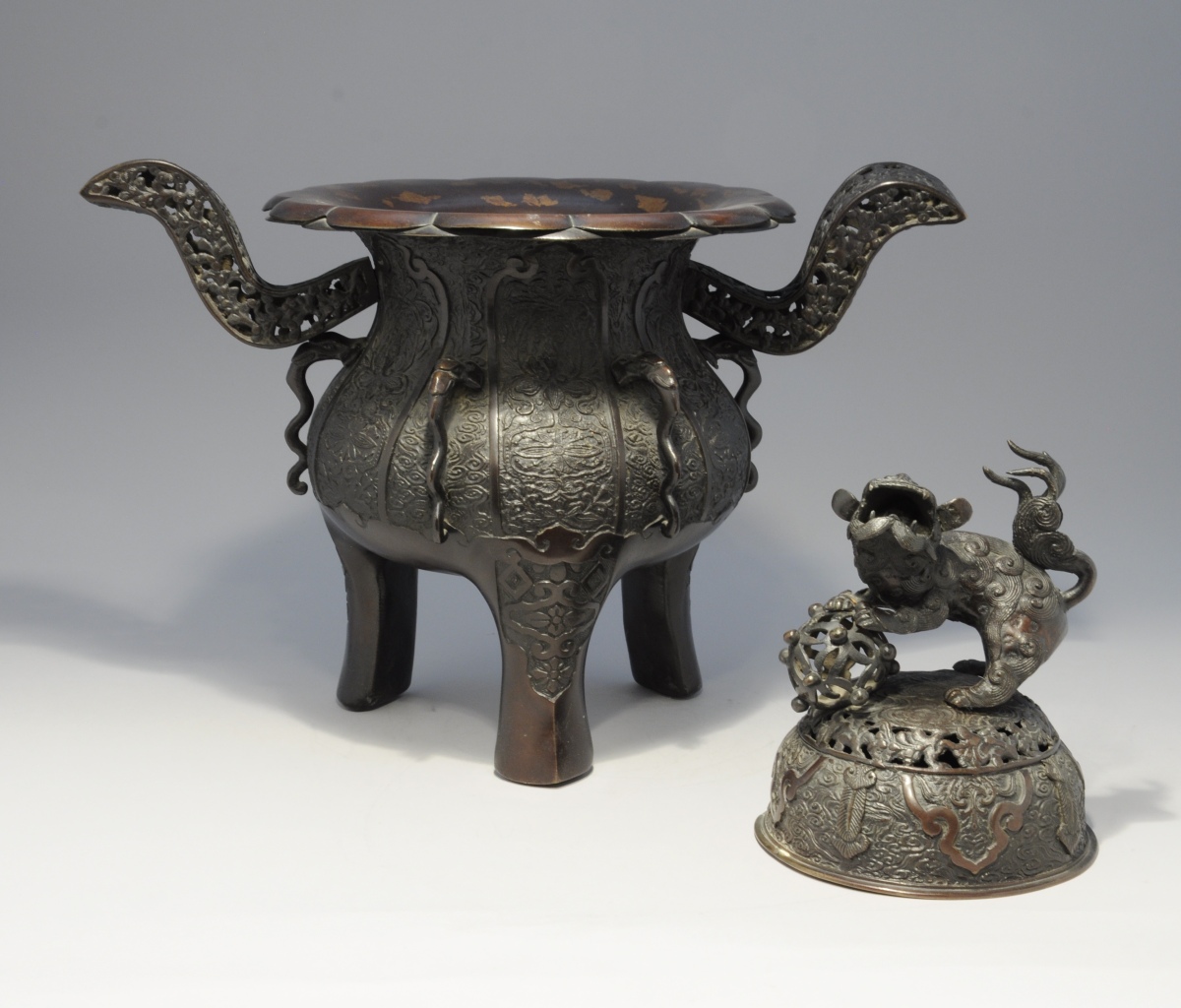 JAPON. Grand BRÛLE-PARFUM tripode en bronze patiné à décors laqué or surmonté d'un lion.