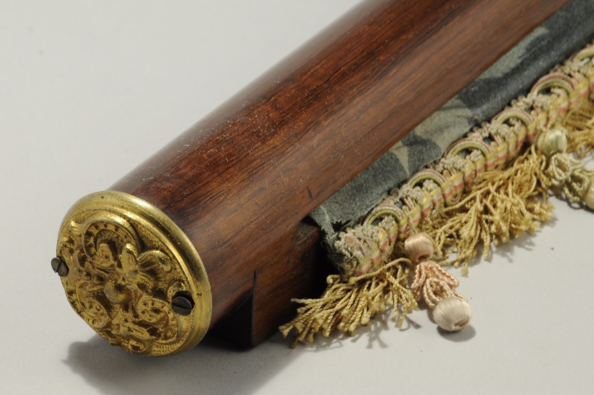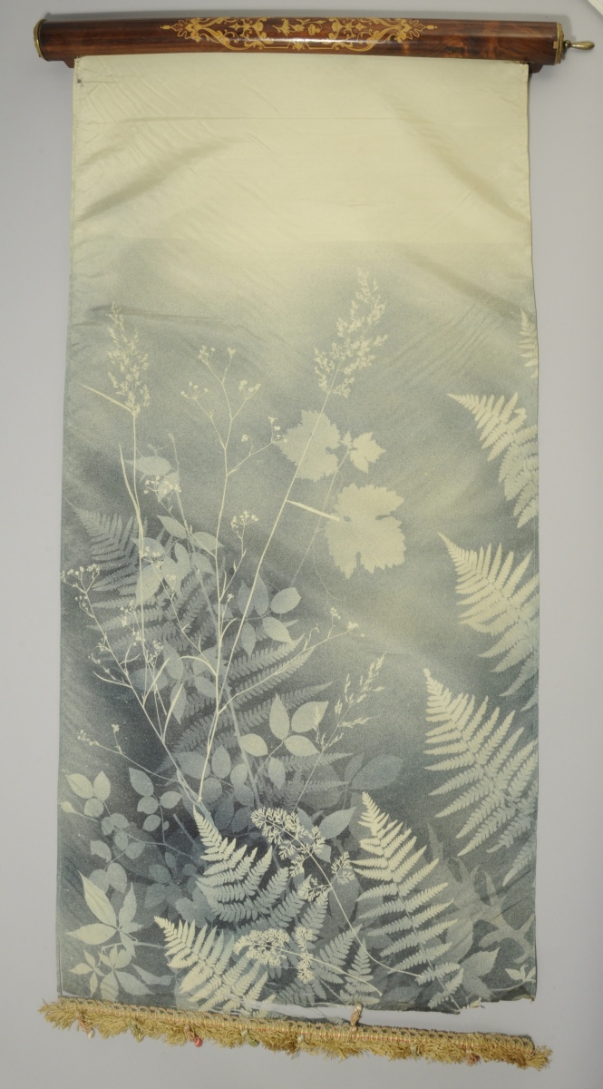 JAPON. PEINTURE sur soie en camaïeux bleu figurant des végétaux. Étui circulaire en palissandre et marqueterie de bois clair.