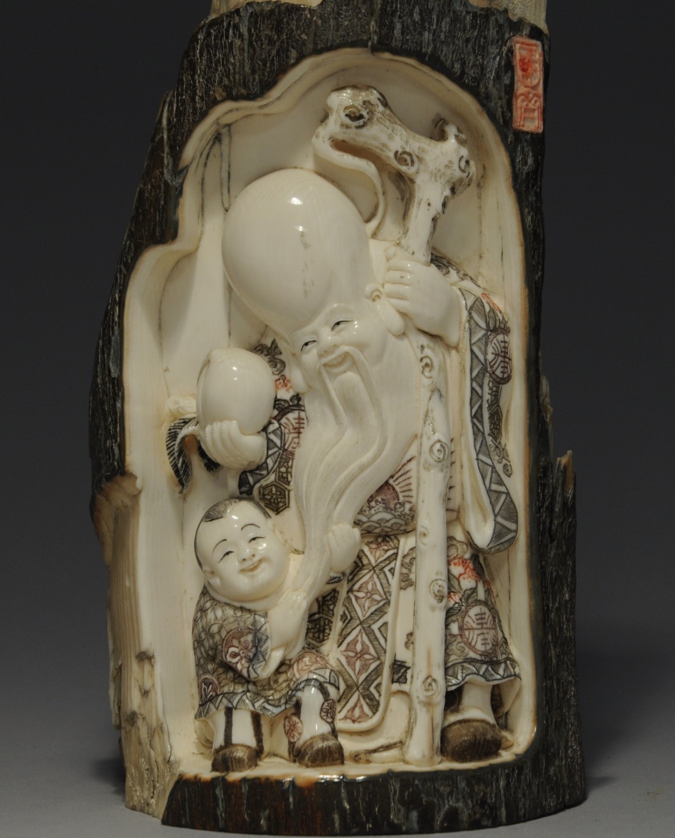 CHINE. DÉFENSE de mammouth sculptée, cachet.