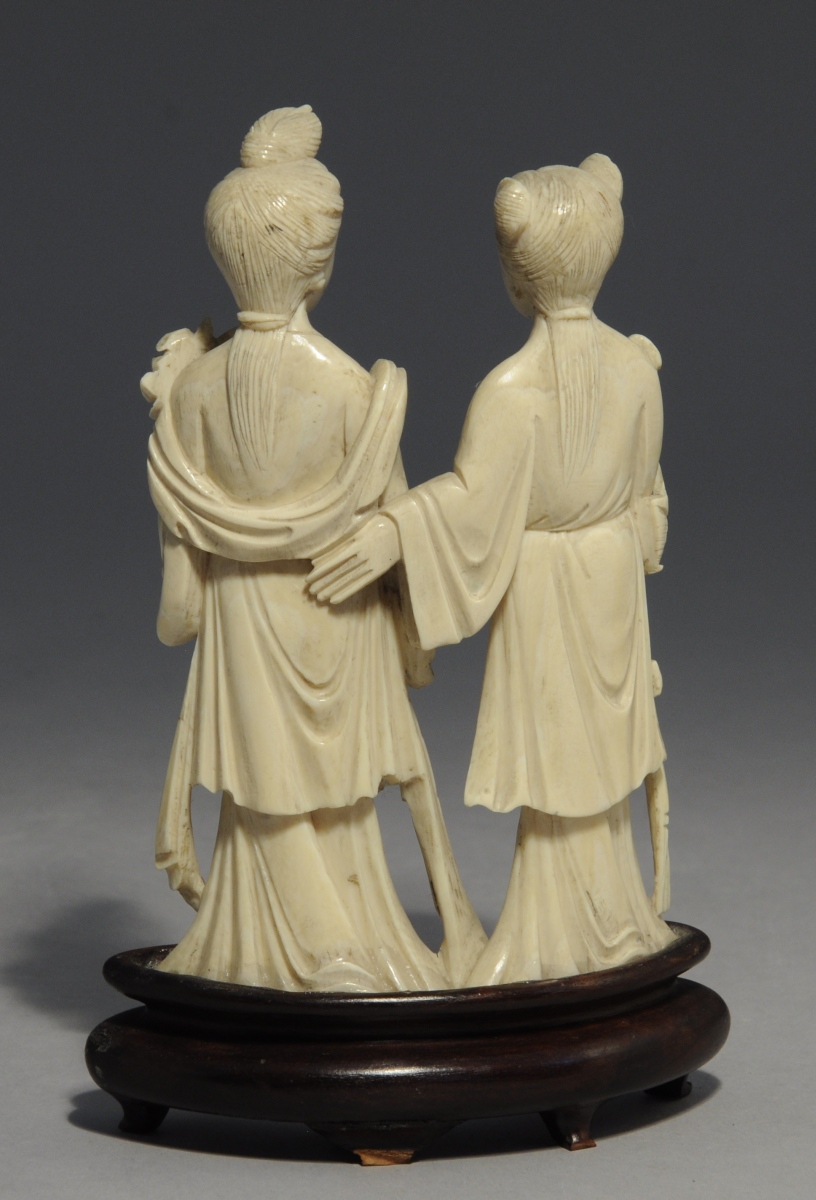 STATUETTE en ivoire sculpté représentant deux femmes, l'une tenant un panier, l'autre une fleur. Socle en bois.