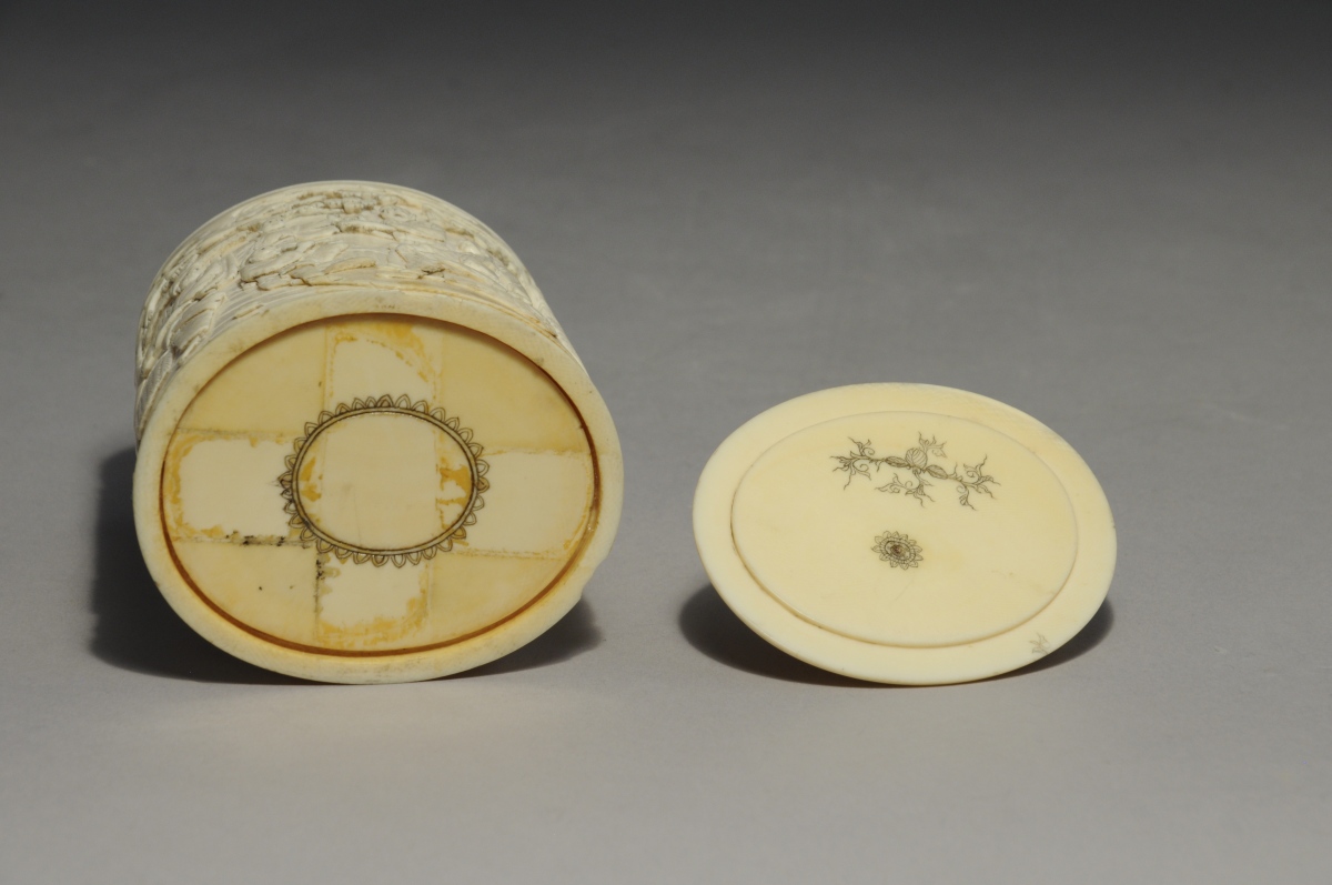 POT COUVERT de forme ovale en ivoire sculpté représentant des scènes de vie quotidienne. Couvercle orné de rinceaux avec un petit personnage jouant du tambour en guise de prise.
