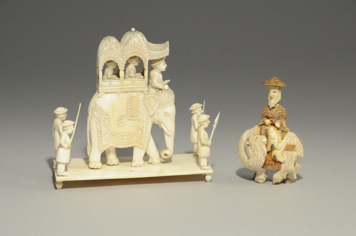STATUETTE en ivoire sculpté figurant un éléphant encadré de quatre soldats transportant deux personnages sous un dais.